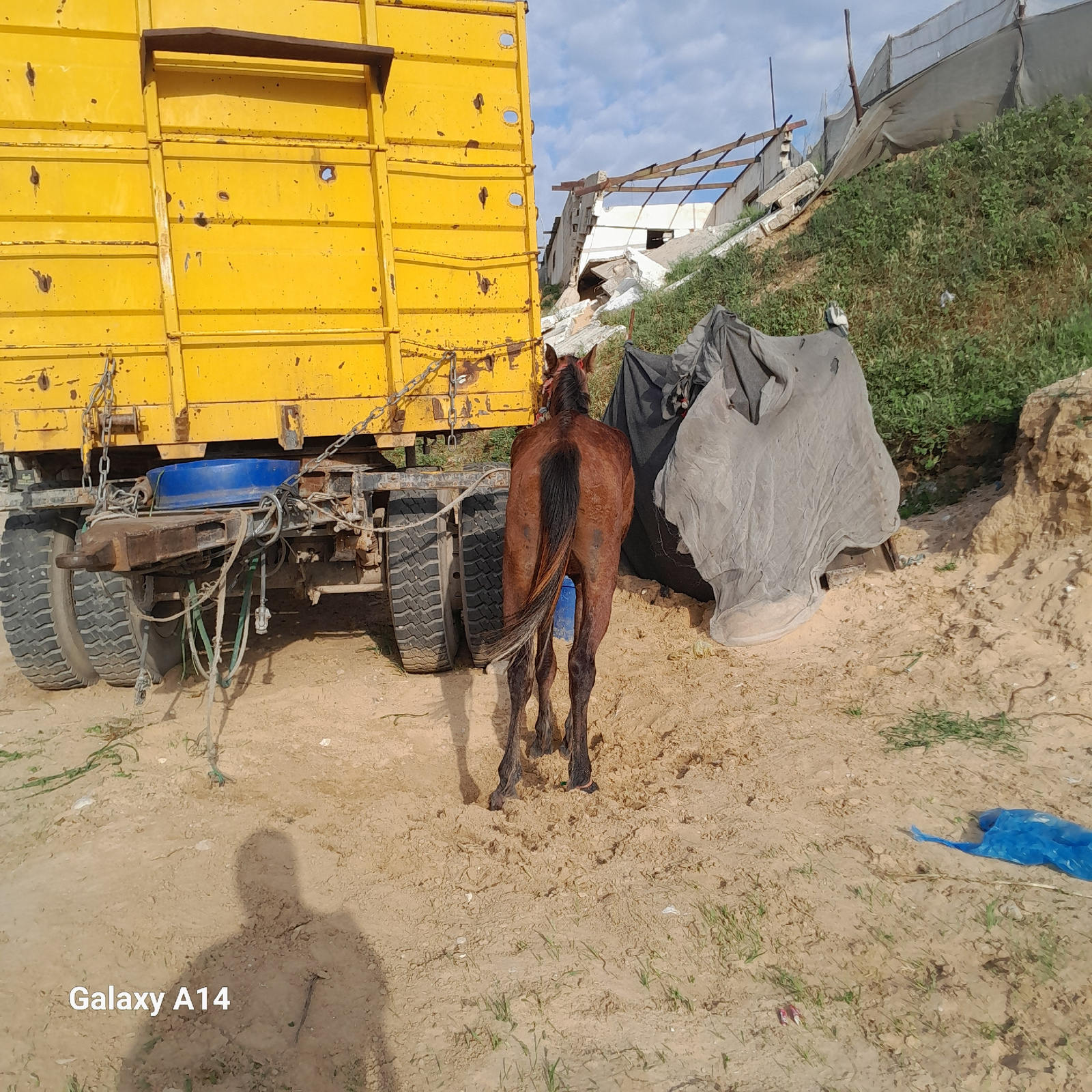 This image captures an outdoor scene in Khan Yunis, Palestinian Territory, under a partly cloudy sky. In the foreground, a blurred human shadow is cast onto sandy ground, below which the text "Galaxy…read more