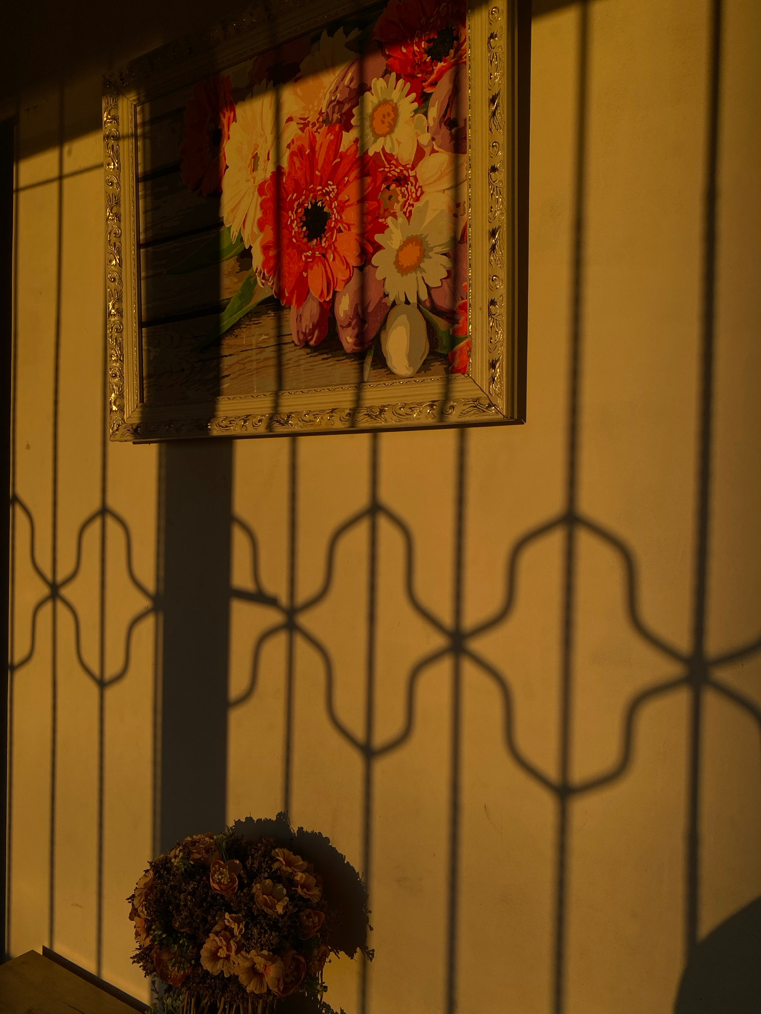 The image depicts an interior scene. A framed painting of flowers hangs on a light yellow wall. To the right of the painting is a dried flower arrangement. Shadows from a decorative window grate are c…read more