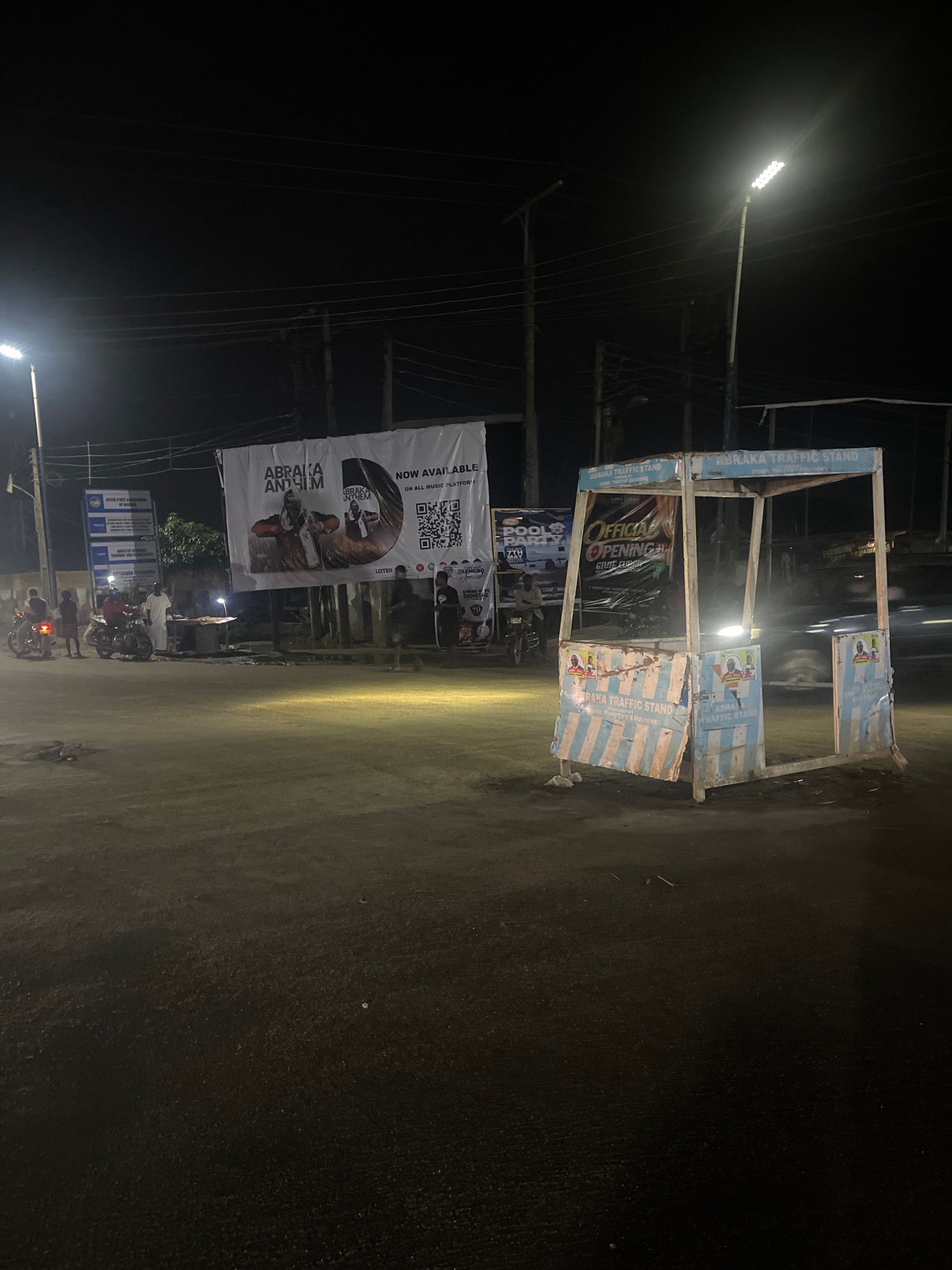 The image, taken at night in Abraka, Nigeria, showcases a street scene dominated by commercial displays. Prominently featured is a ramshackle, empty structure labeled "ABRAKA TRAFFIC STAND," its panel…read more