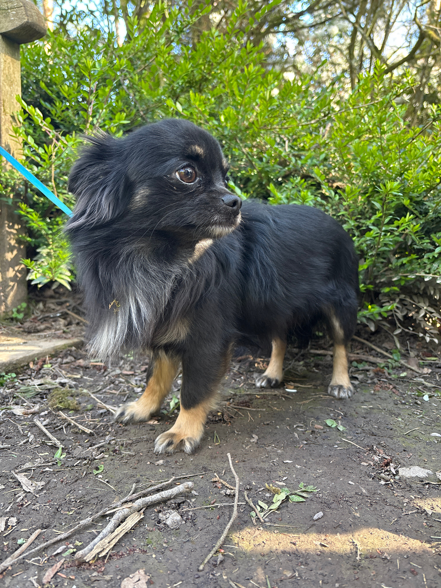 A long-haired Chihuahua dog stands on dirt and is leashed with a blue leash. The dog is mostly black with some brown coloration around its legs. To the left of the dog is dirt, sticks, and leaves. To…read more