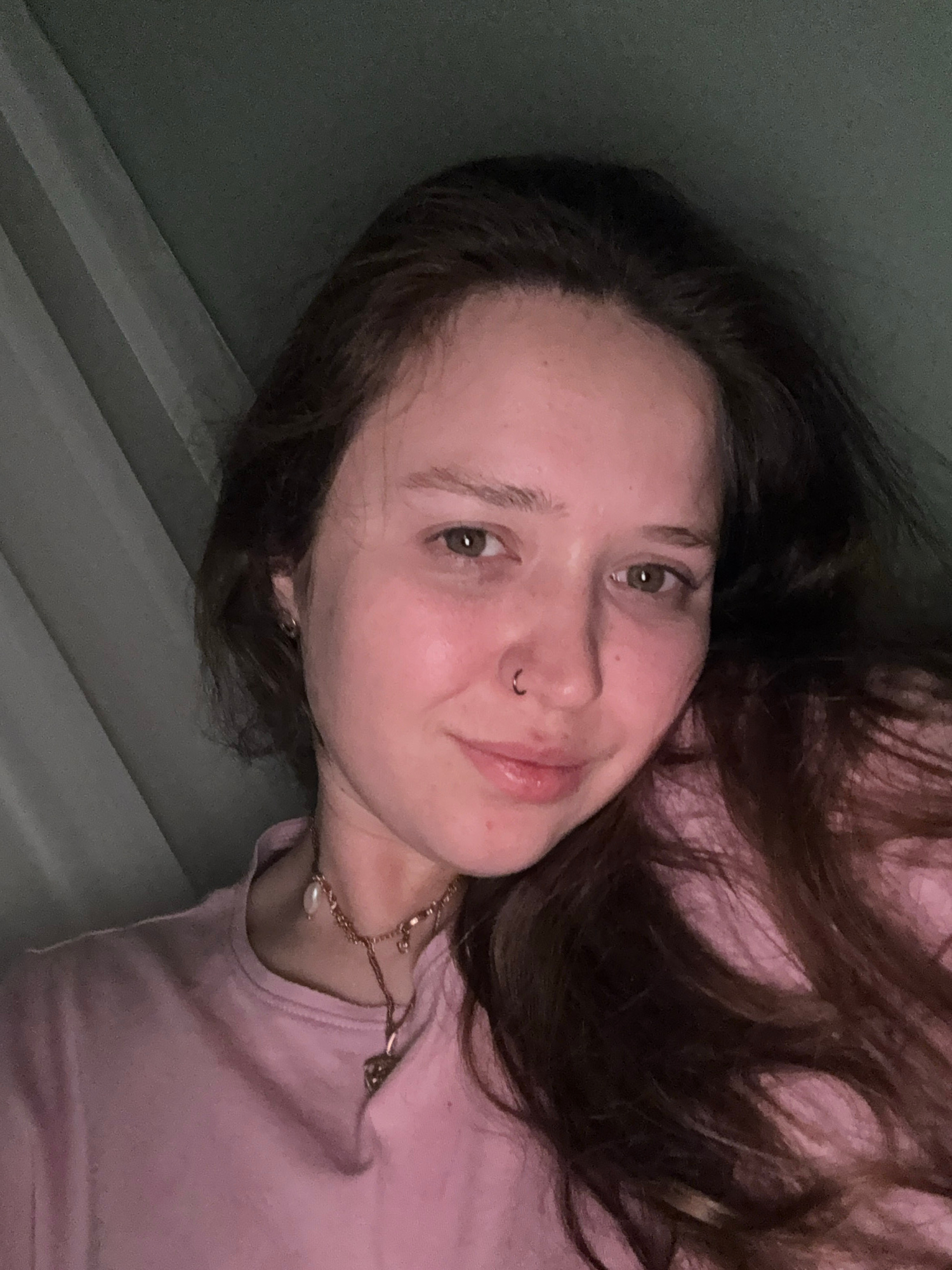 A young woman with long, dark brown hair is captured in a close-up, upward-facing selfie, lying down in what appears to be an indoor setting. She has hazel eyes, a natural complexion, and a small hoop…read more