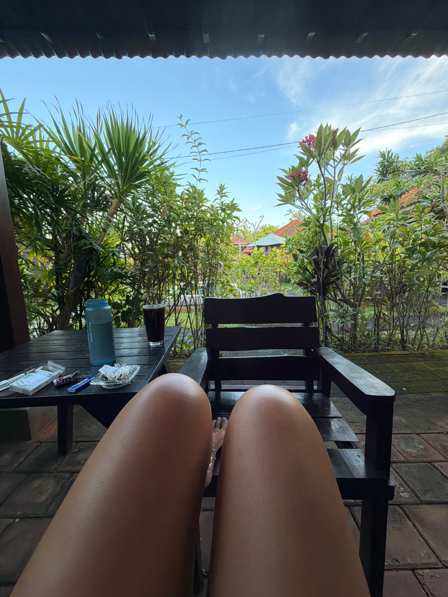 The image shows a partial view from a chair in what appears to be a garden or patio setting in Kutuh, Indonesia. Two legs of a person, tan in color, are visible. In the foreground, there is a dark woo…read more