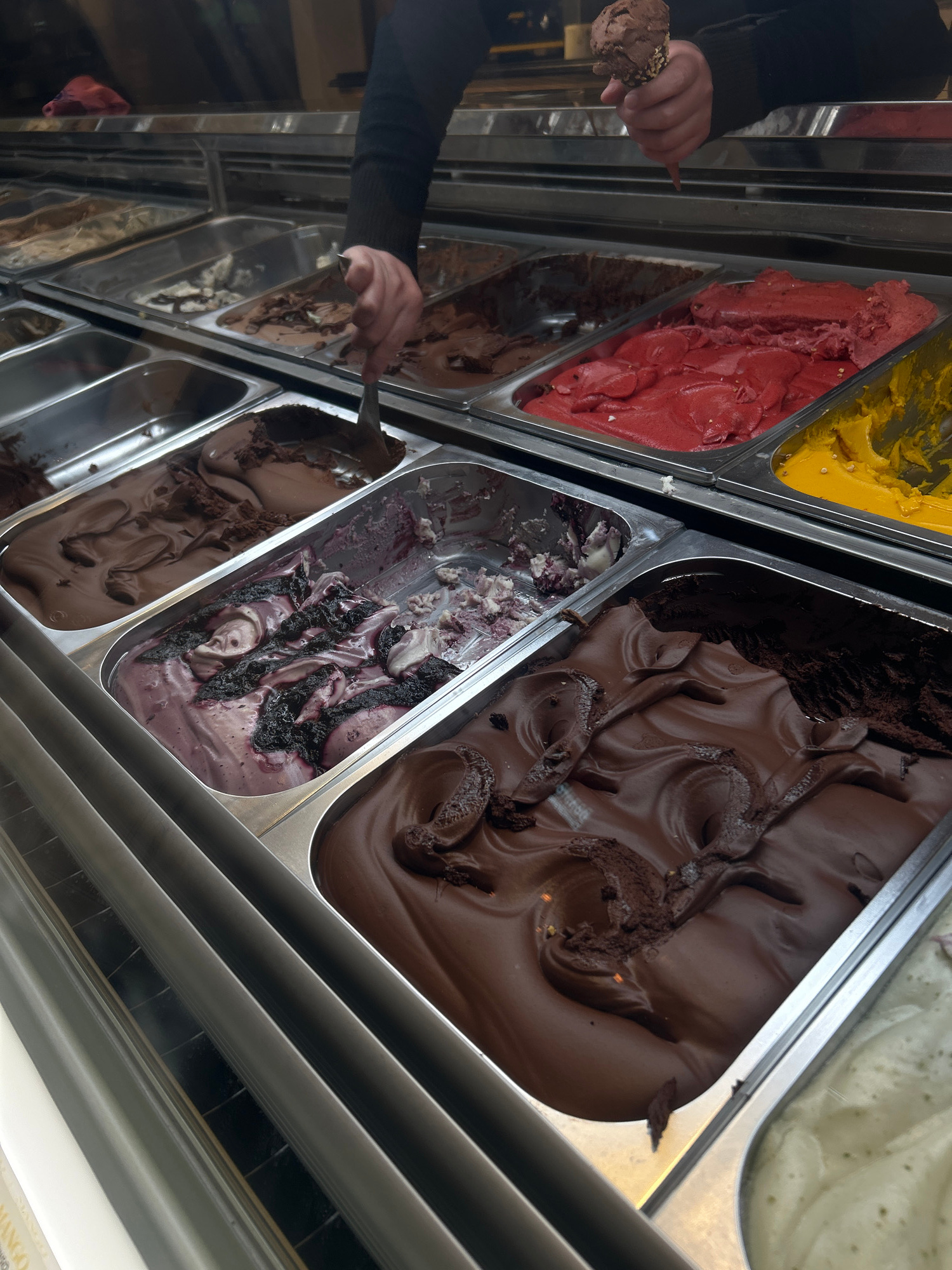 The image shows a person scooping gelato from a display case. The gelato flavors visible include yellow, red, various shades of brown, and a light purple with dark inclusions. The person is holding a…read more