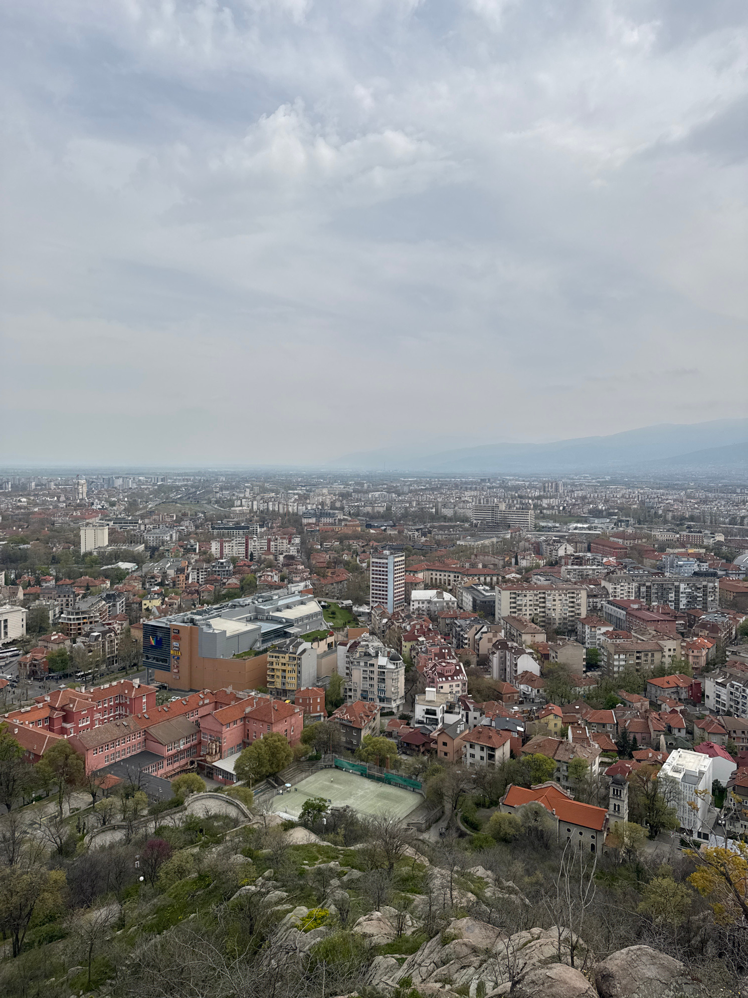 This is an aerial view of the city of Plovdiv, Bulgaria, taken from the Nebet Tepe hill. The image showcases the city's landscape, including the urban area with its buildings, structures, and infrastrβ¦read more