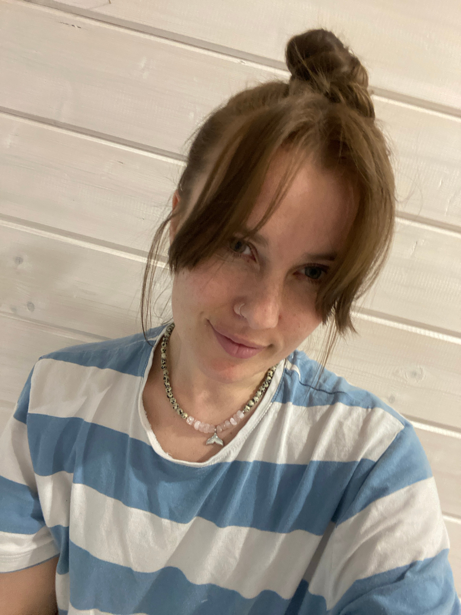 A person with light skin and brown hair pulled back into a bun is facing the camera with a slight smile. They are wearing a blue and white striped shirt and a beaded necklace. The background appears t…read more