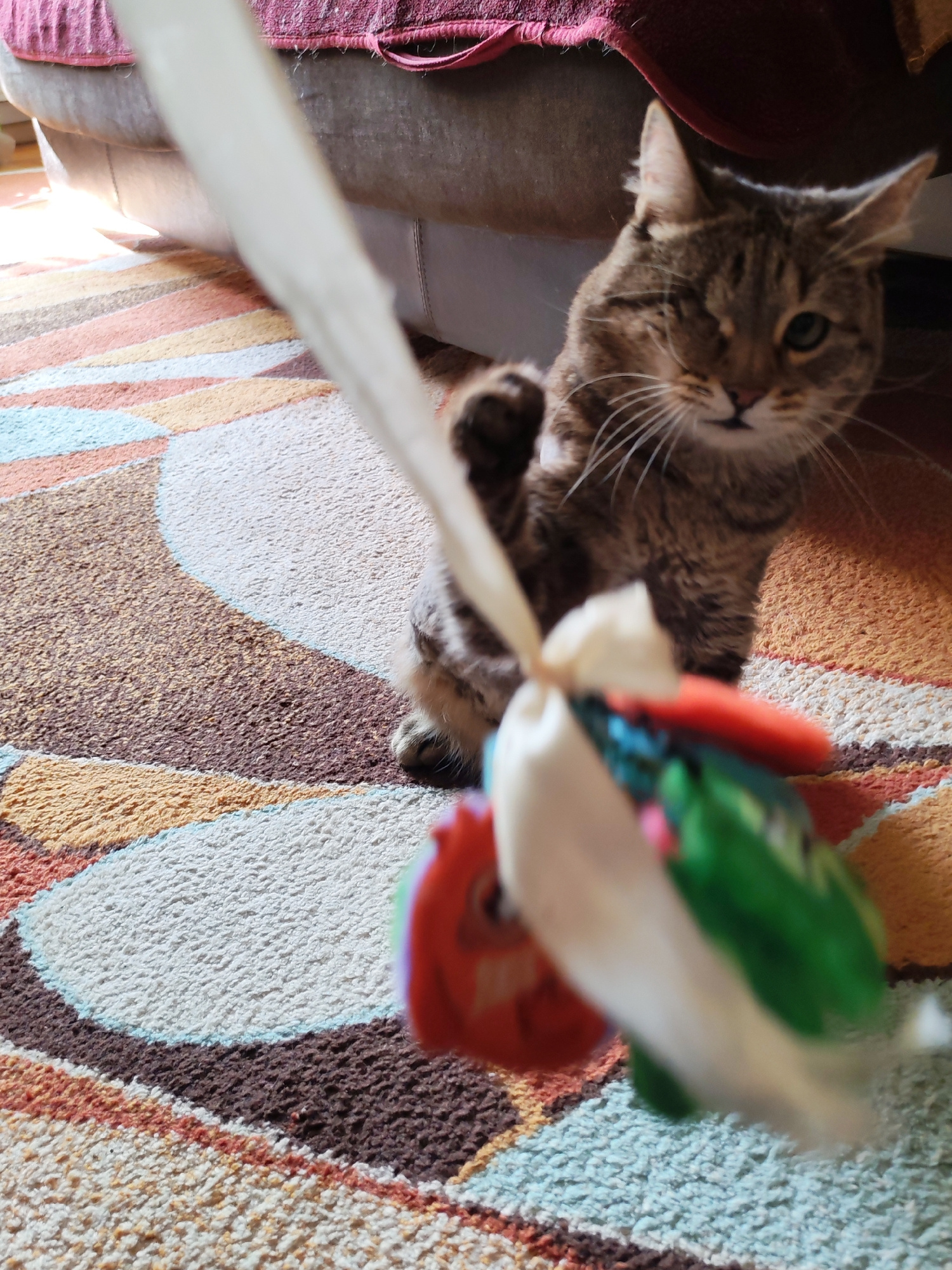 This image, taken in Izhevsk, Russia, features a playful tabby cat indoors. The main subject is a brown and black striped cat, distinctive for having only one eye visible, its left eye from the viewerβ¦read more