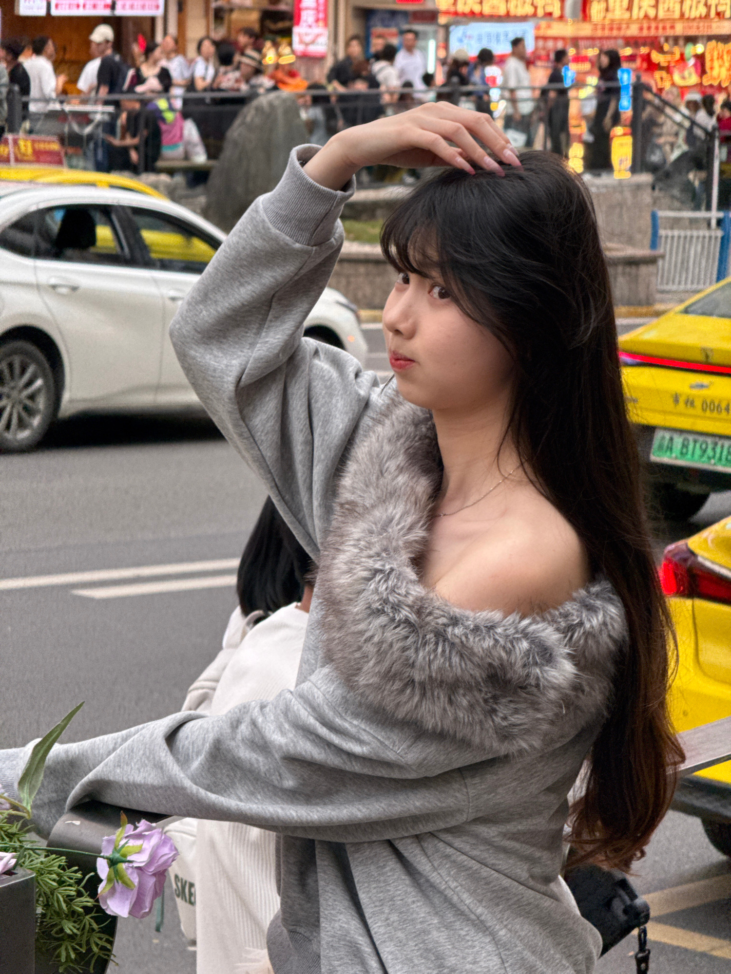 A young woman stands on a city street in Liangjiang, China, holding her hair with her right hand. She is wearing a grey sweatshirt with a faux fur collar. In the background is a white sedan, a yellow…read more