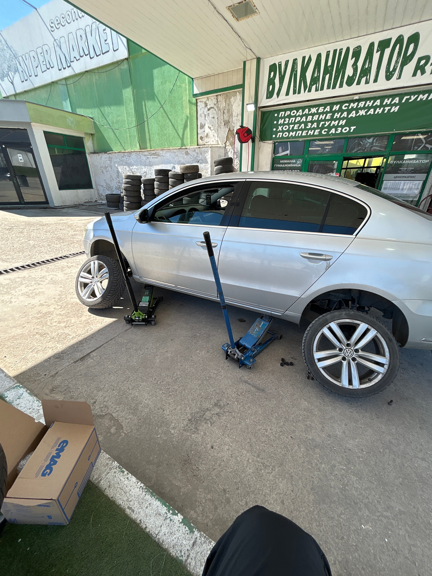 The image shows a silver passenger car with its front right wheel removed, held up by a blue trolley jack in front of a tire shop, possibly in Varna, Bulgaria. The car's front left wheel has been repl…read more