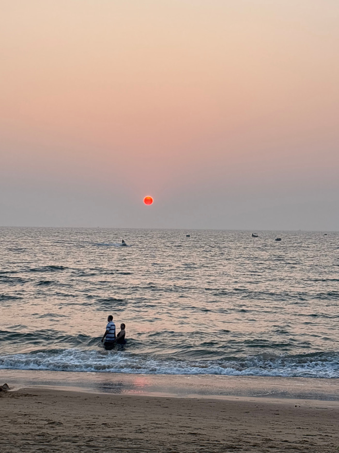 This image depicts a sunset over the Arabian Sea at Sinquerim, India. The sky displays a gradient of pale orange and pink hues, transitioning to lighter tones overhead. A prominent, bright red-orange…read more