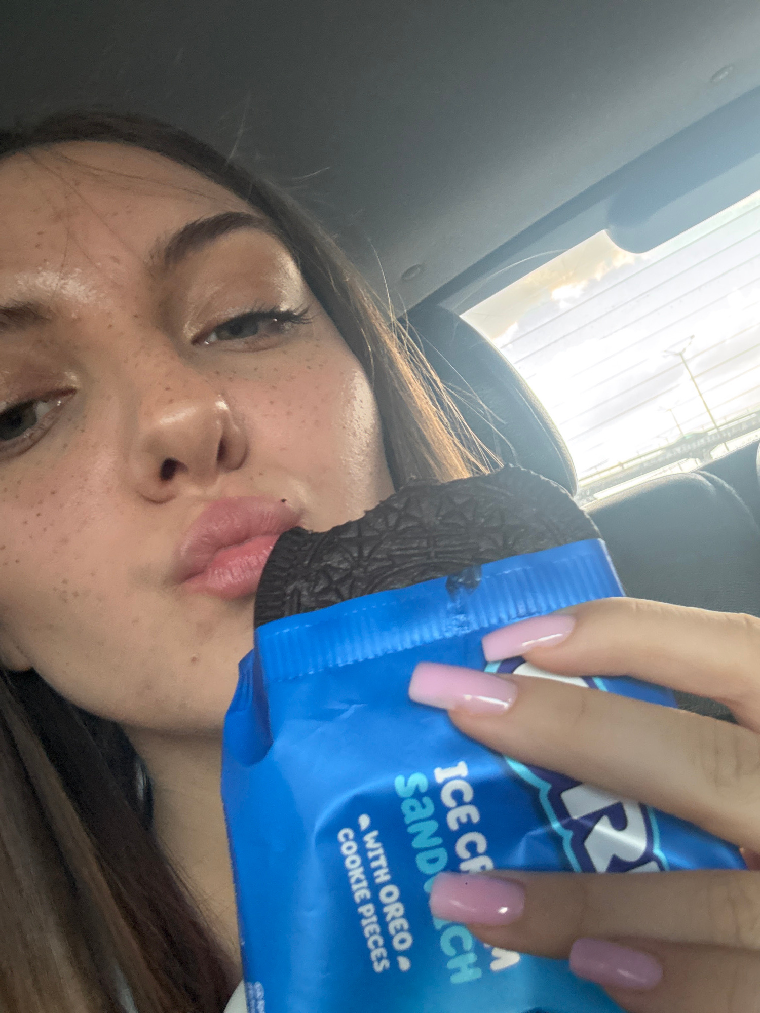 A close-up, high-angle, and slightly tilted photograph captures a person eating an Oreo Ice Cream Sandwich inside what appears to be a car, likely in Sofia, Bulgaria. The central subject is a young wo…read more