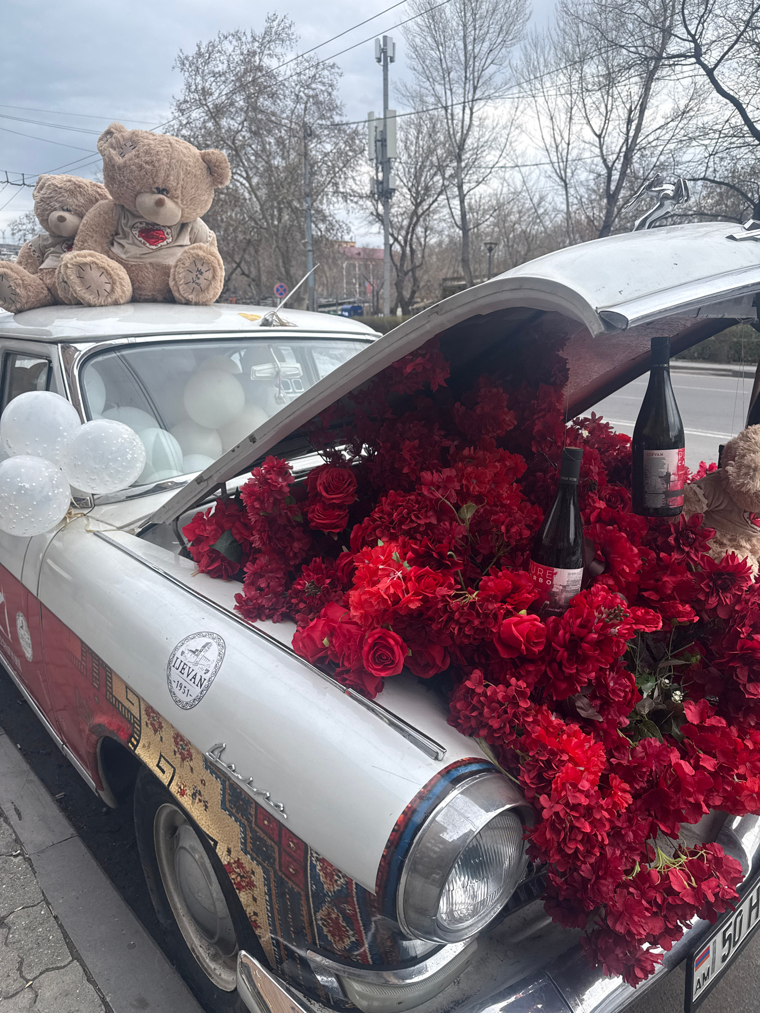 The image captures a vintage car in Yerevan, Armenia, heavily decorated for a celebration or display. The car, predominantly white, features a hood open and overflowing with red flowers and two bottleβ¦read more