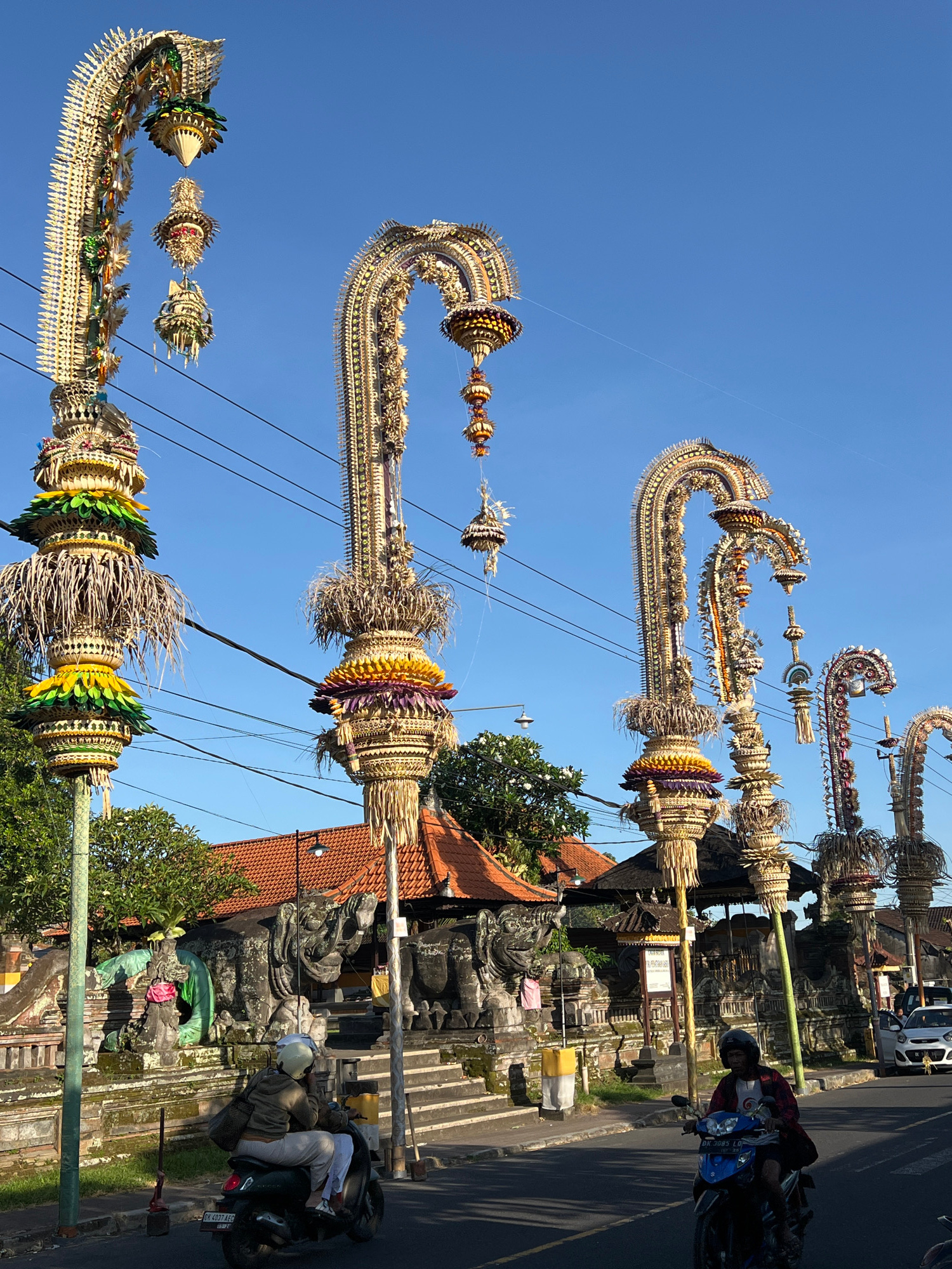 The image depicts a street scene in Blahbatuh, Indonesia, under a clear blue sky. Tall, elaborately decorated bamboo poles, known as Penjor, line the side of the road. These Penjor are adorned with wo…read more