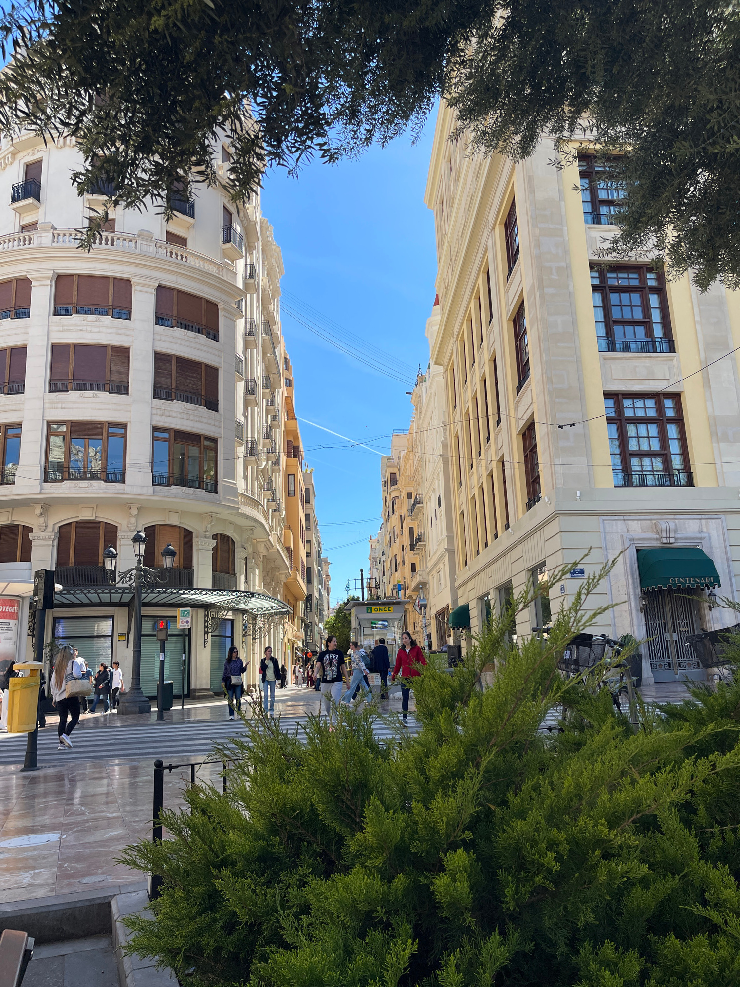 The image depicts a street in Valencia, Spain, specifically Carrer de les Barques near Plaça de l'Ajuntament. The perspective is from street level, looking upwards. Tall buildings line both sides of t…read more