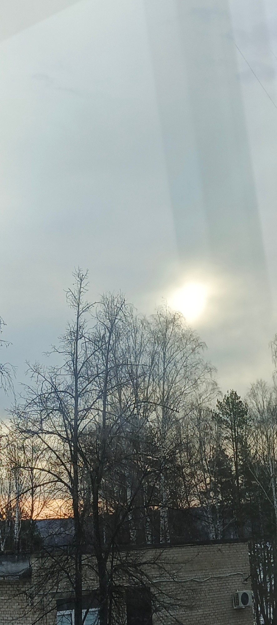 The image appears to be taken from indoors, looking out a window at a scene in the city of Chaikovsky, Russia. The sky is overcast with the sun visible through the clouds. The foreground is dominated…read more