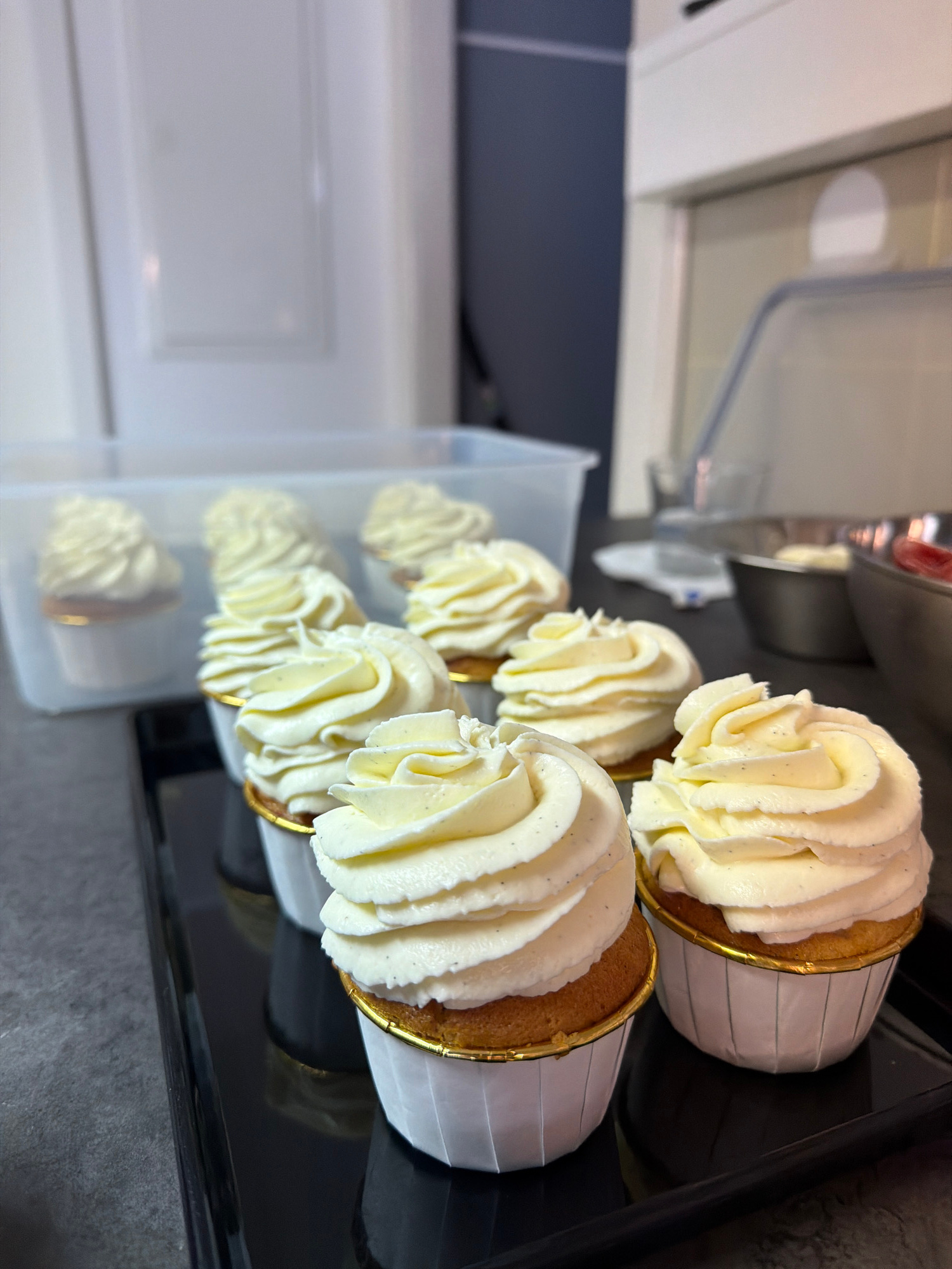 A close-up, diagonally oriented shot displays a row of freshly frosted cupcakes, likely captured indoors in a kitchen or bakery setting in Meisenheim, Germany. The main subjects are numerous cupcakes,…read more
