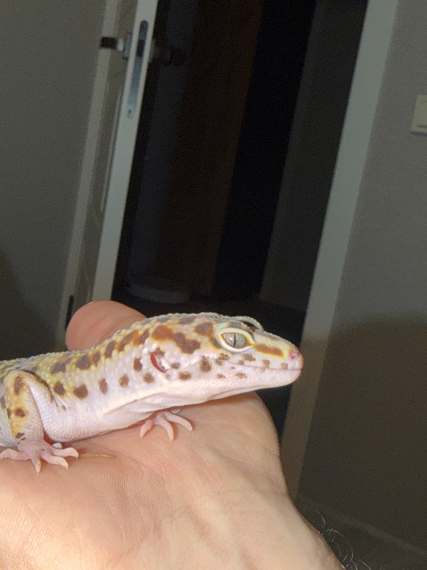 A gecko is held in a person's hand. The gecko is light-colored with brown spots. The background shows a wall with a window. The location cannot be determined from the given image.