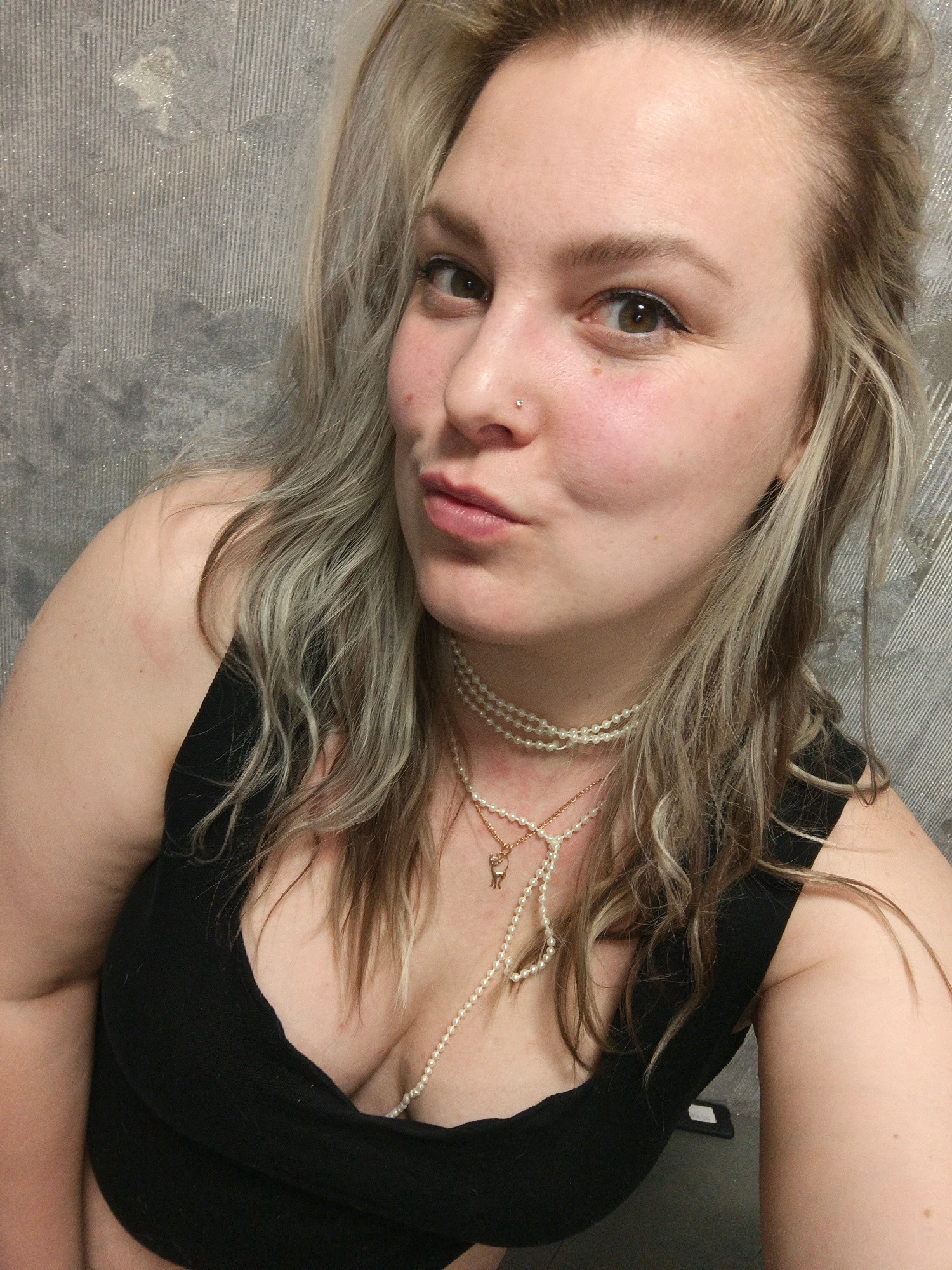 A blonde-haired woman with fair skin is posing for a selfie. She is wearing a black low-cut top and multiple pearl necklaces, one with a gold pendant. Her lips are pursed in a kiss. A nose piercing is…read more