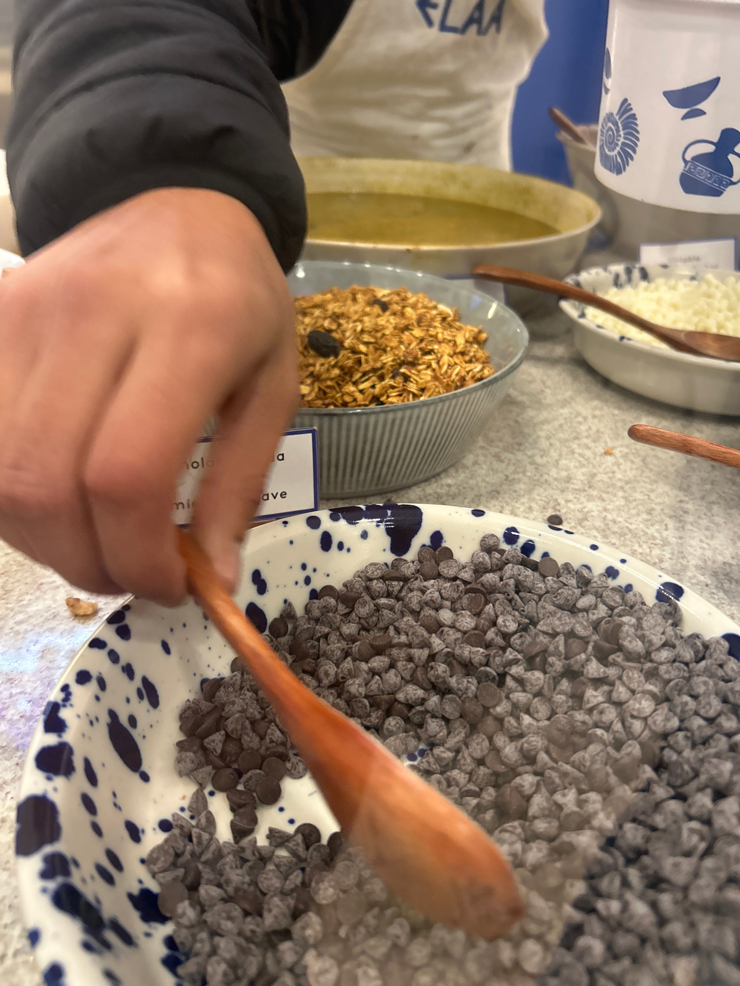 The image shows a person using a wooden spoon to scoop chocolate chips from a large white and blue speckled bowl. The bowl is filled with a variety of chocolate chips. A bowl of granola and a bowl ofโฆread more