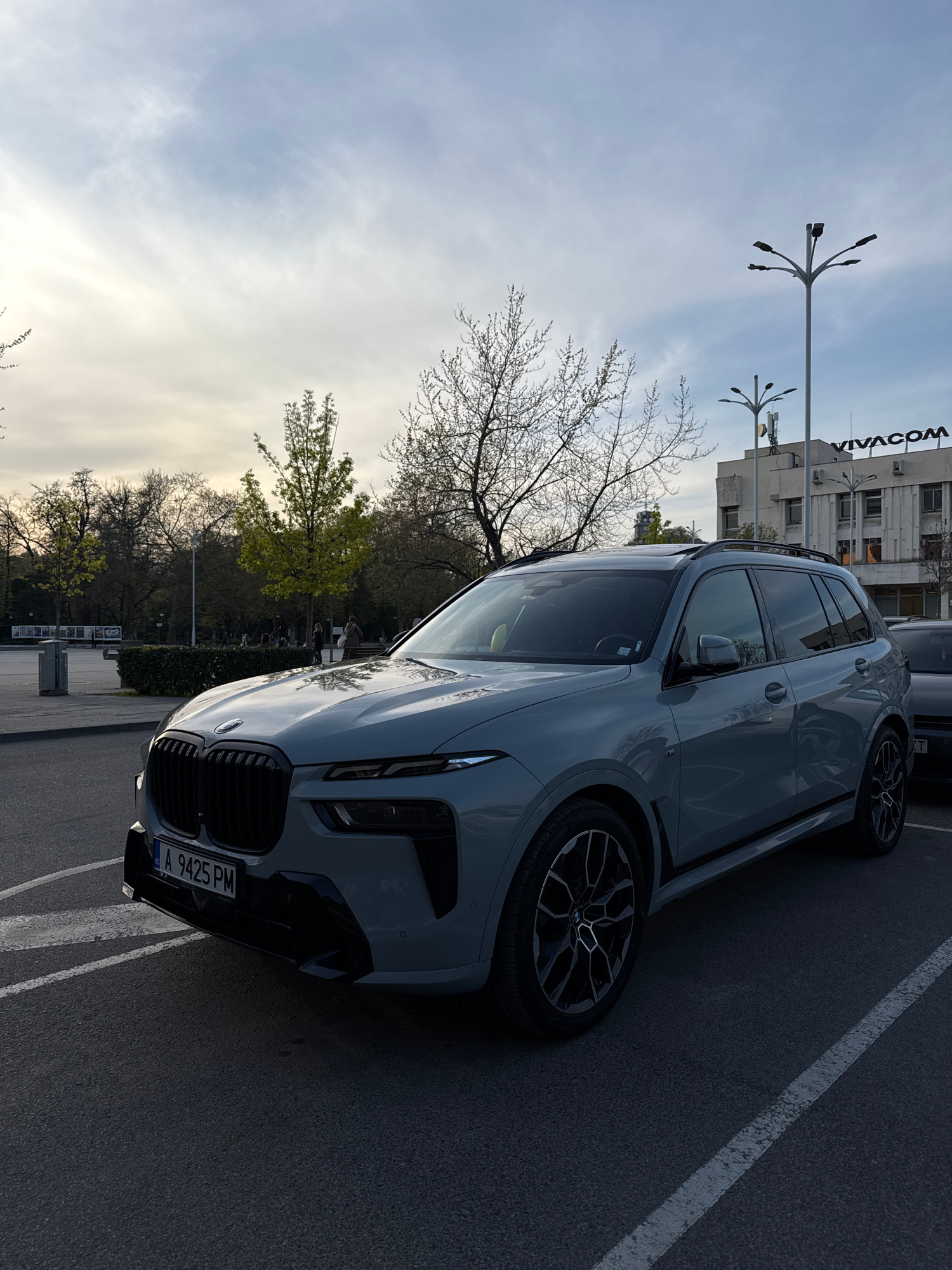 A light gray BMW X5 is parked in an asphalt parking lot. The license plate reads "A 9425 PM." The front of the car is in the foreground. Behind the car is a row of trees. In the background, a light-co…read more