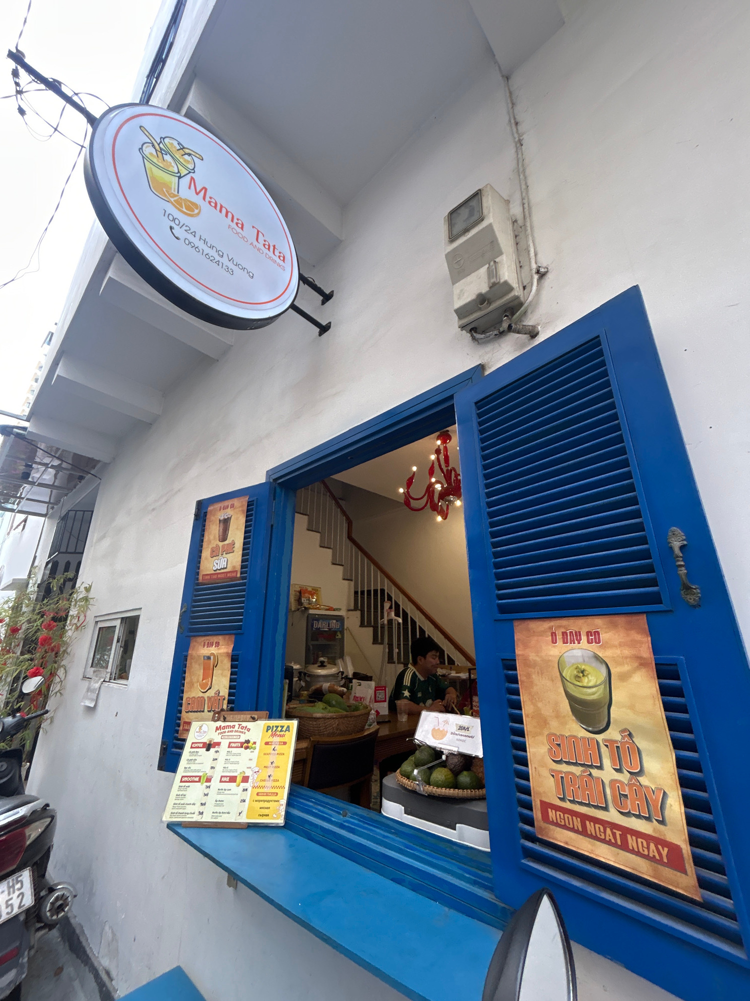 The image shows the exterior of "Mama Tata FOOD AND DRINKS" at 100/24 Hung Vuong in Nha Trang, Vietnam. An open, blue window or door serves as the service area. Posters and menu cards advertising drin…read more