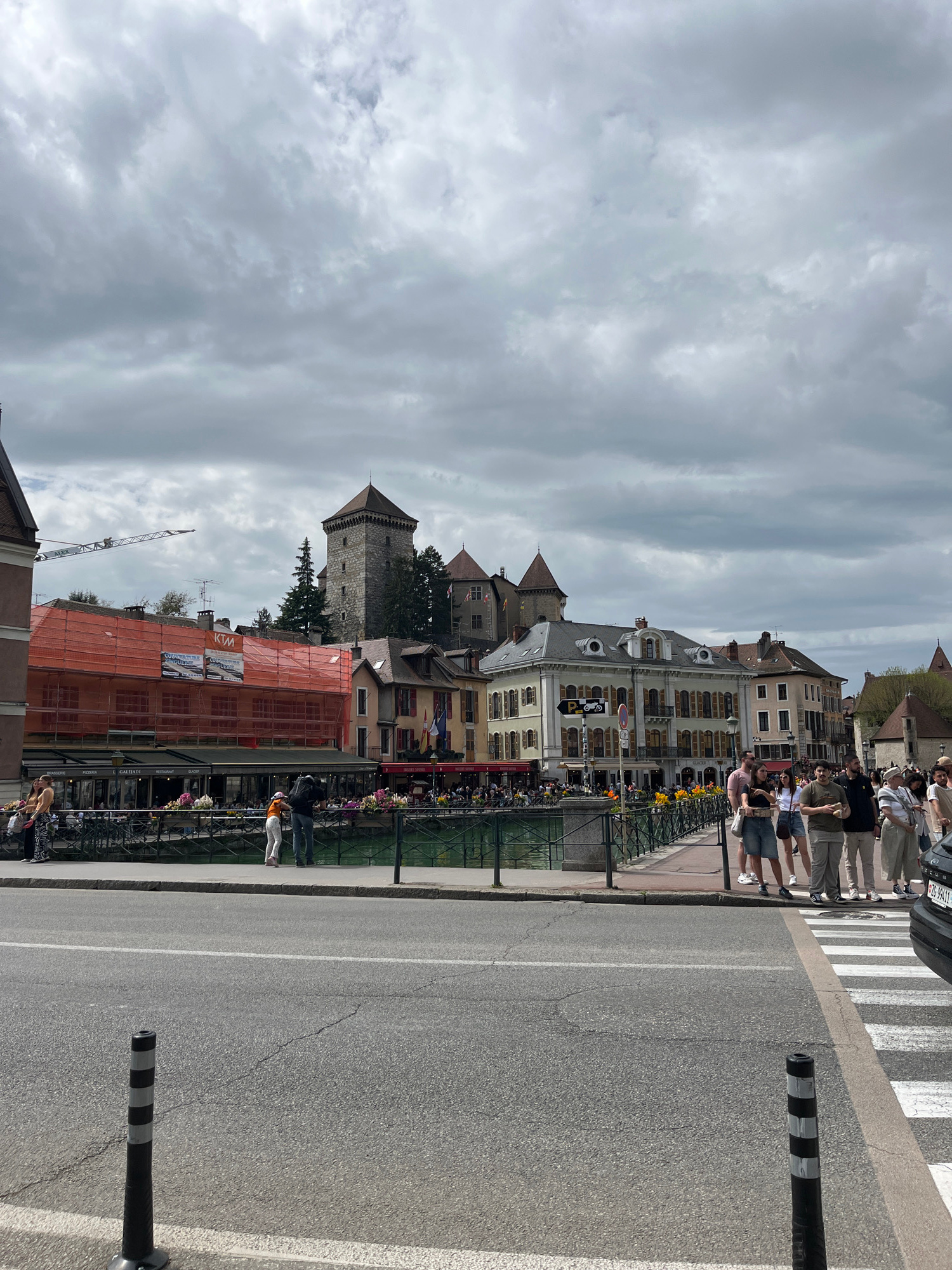 This image shows a street in Annecy, France, with buildings and a pedestrian crosswalk. The sky is overcast. There are several people visible on the sidewalk, some of whom are crossing the street. One…read more