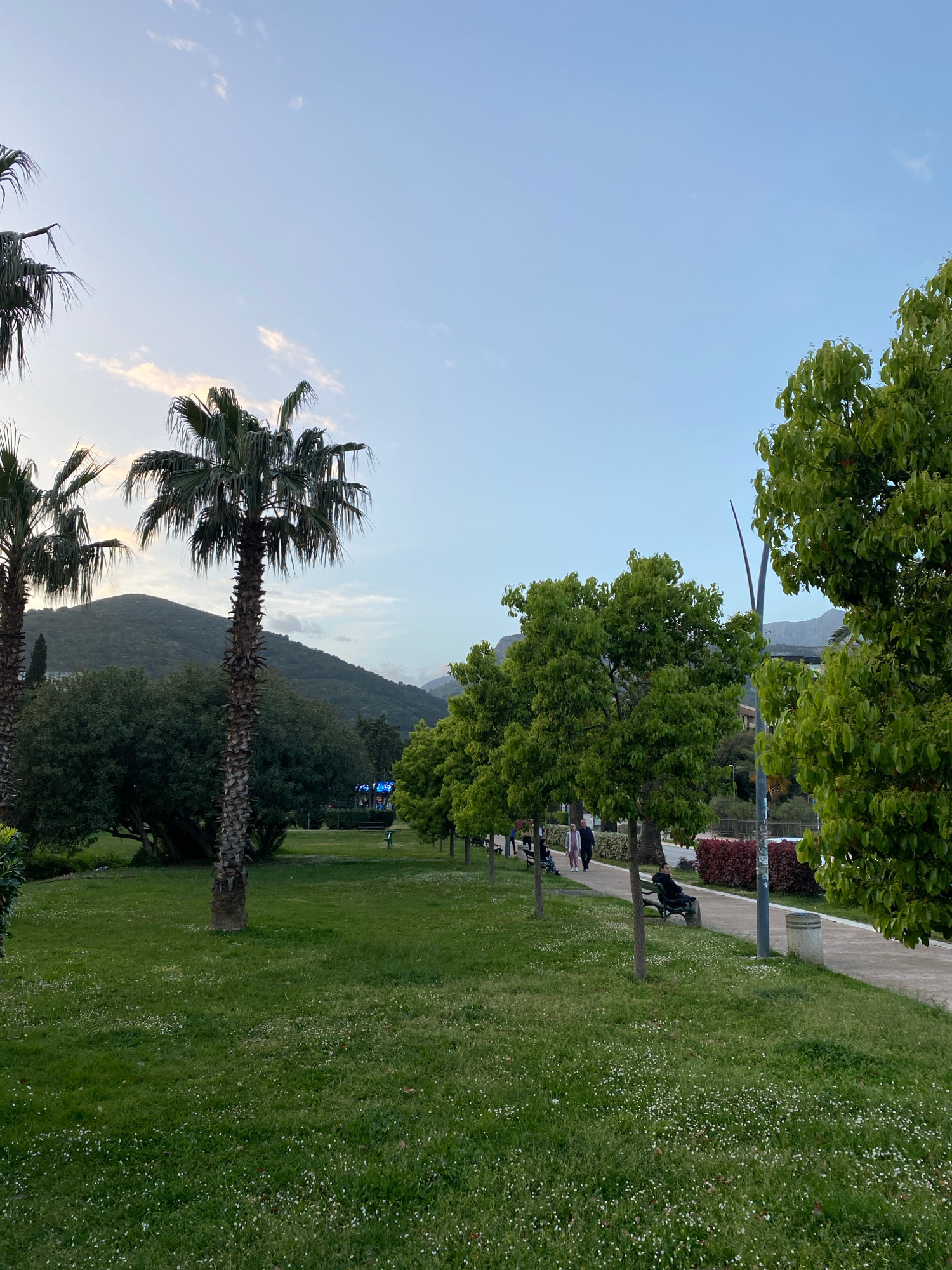 The image shows a park in Budva, Montenegro. There is green grass with white flowers, and there are palm trees. There are deciduous trees, mountains, people sitting on benches and a light pole. The sk…read more