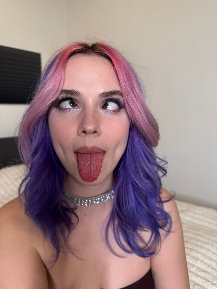 A female subject is depicted in a close-up indoor portrait, visible from the chest up. She has long, wavy hair featuring prominent pink and purple dye, with darker roots visible at the scalp. Her eyes…read more