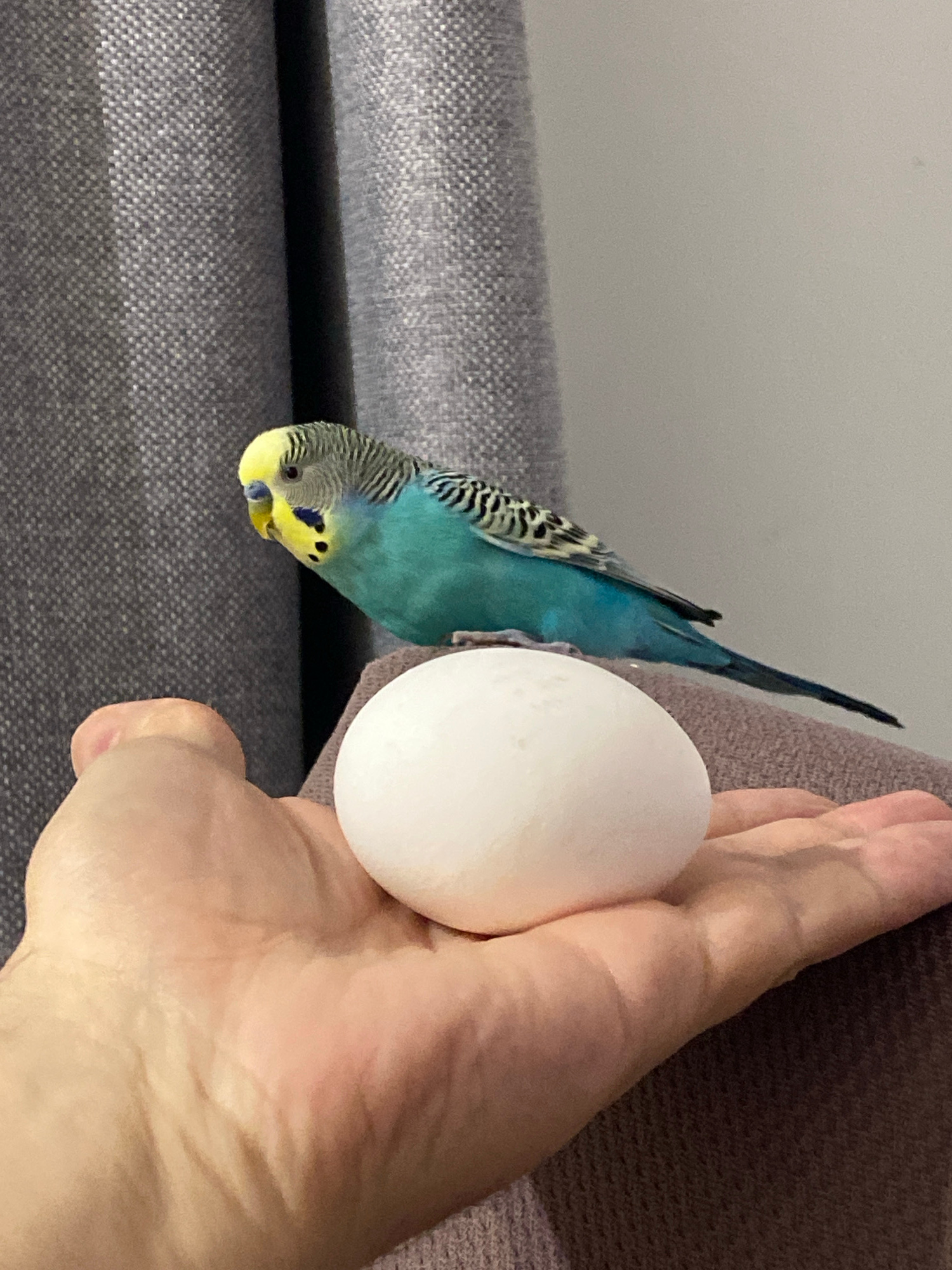 An indoor, eye-level shot captures a curious blue and yellow budgerigar interacting with a human hand and a white, egg-shaped object. The budgie is seen upside down, hanging onto a dark grey, textured…read more