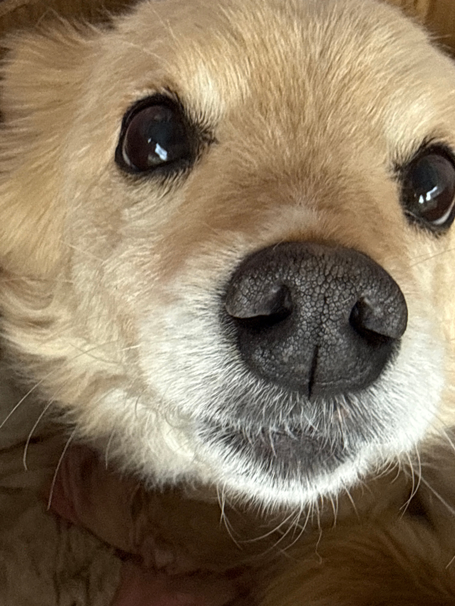 A close-up, high-angle shot captures the face of a dog, likely a Golden Retriever or a similar breed with light fur, against a soft, dark background. The dog's head is tilted, giving the impression it…read more