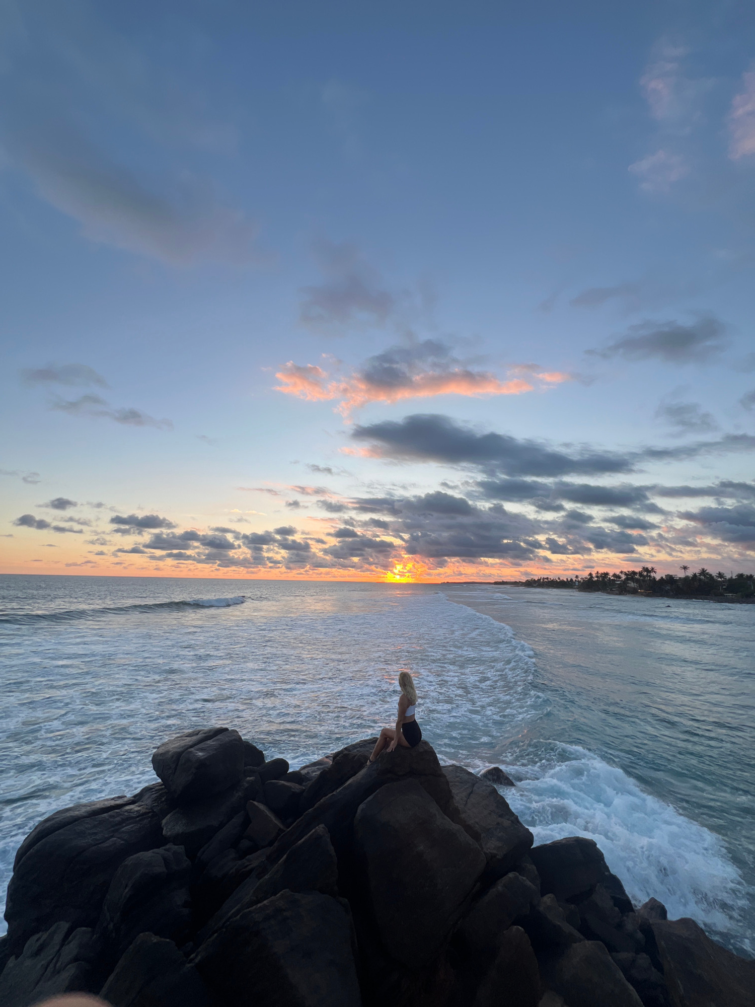 The image shows a sunset scene in Goviyapana, Sri Lanka. The sky is a mix of blue and orange with scattered clouds. Below, the ocean stretches to the horizon where the sun sets, creating a golden glow…read more
