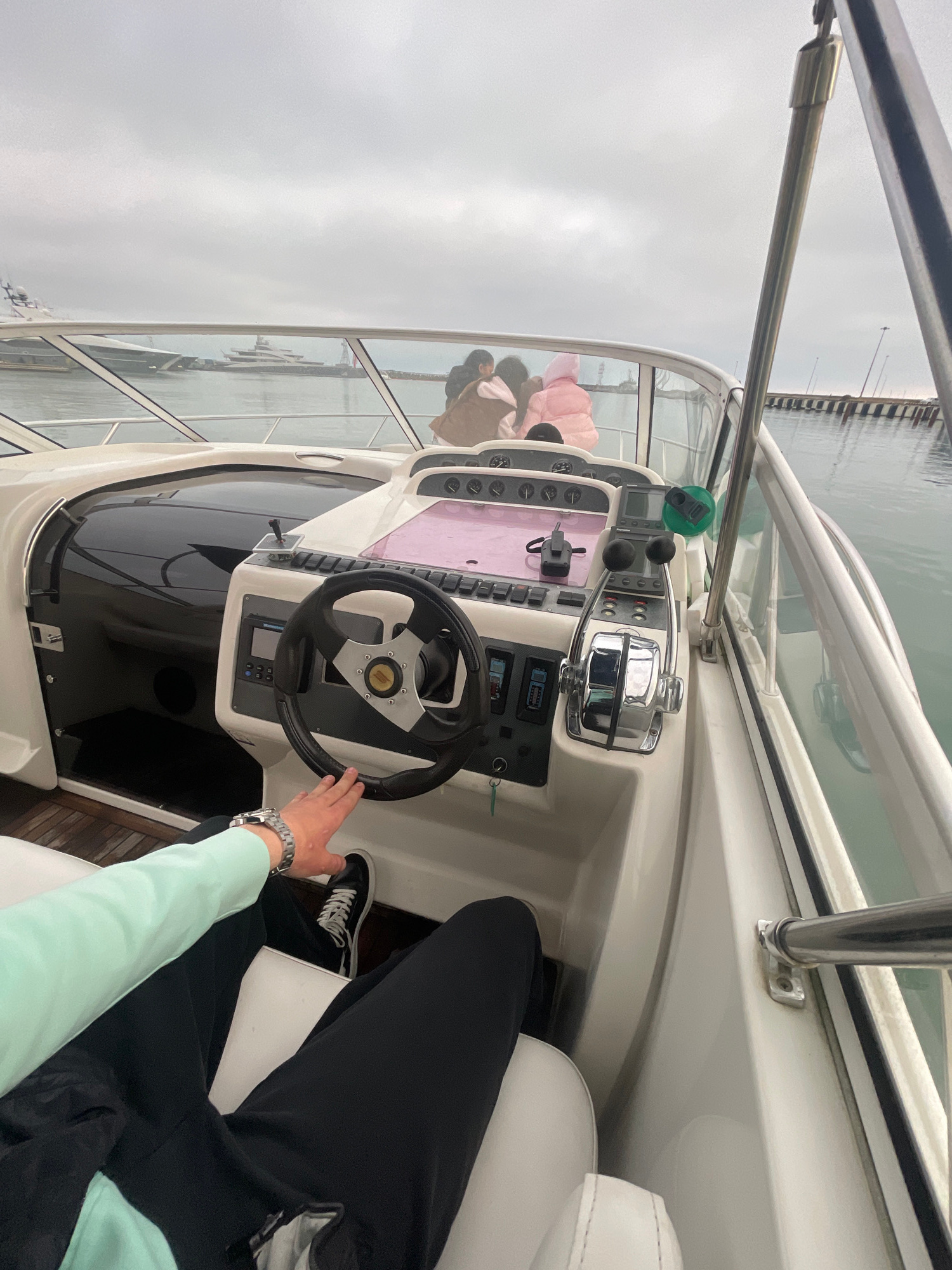 The image shows the interior of a boat's helm station, featuring a steering wheel, various gauges, and a throttle control. A person is seated, with one hand on the steering wheel and wearing a watch.…read more