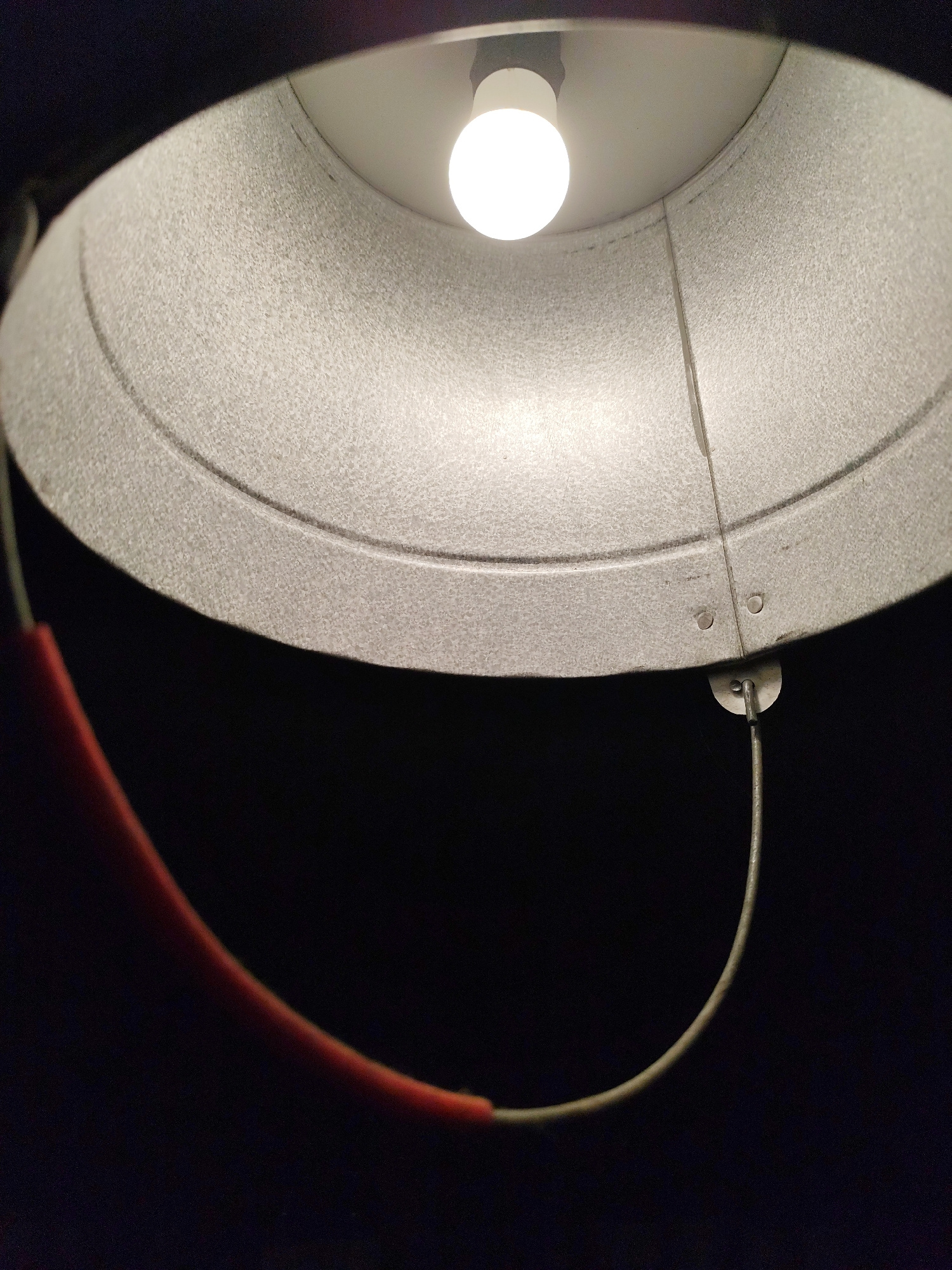 A low-angle shot captures the interior of a metal bucket. A bare incandescent lightbulb illuminates the bucket's interior. A metal wire handle, partially covered by a red sleeve on one side, is attach…read more