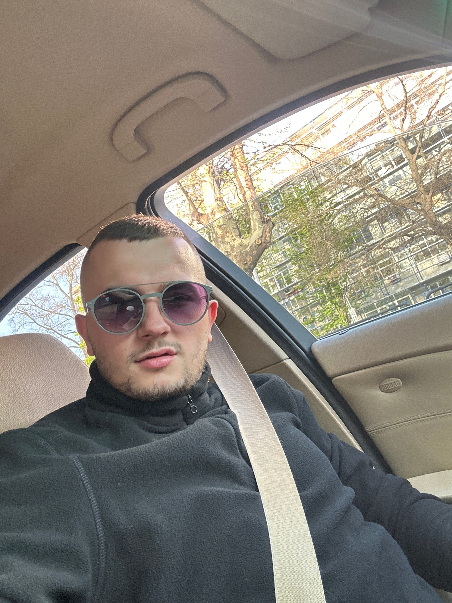 A man is in the passenger seat of a vehicle in Plovdiv, Bulgaria. He wears a black jacket and sunglasses. He is sitting in a car with a sunroof. Through the sunroof, we can see trees and a building in…read more