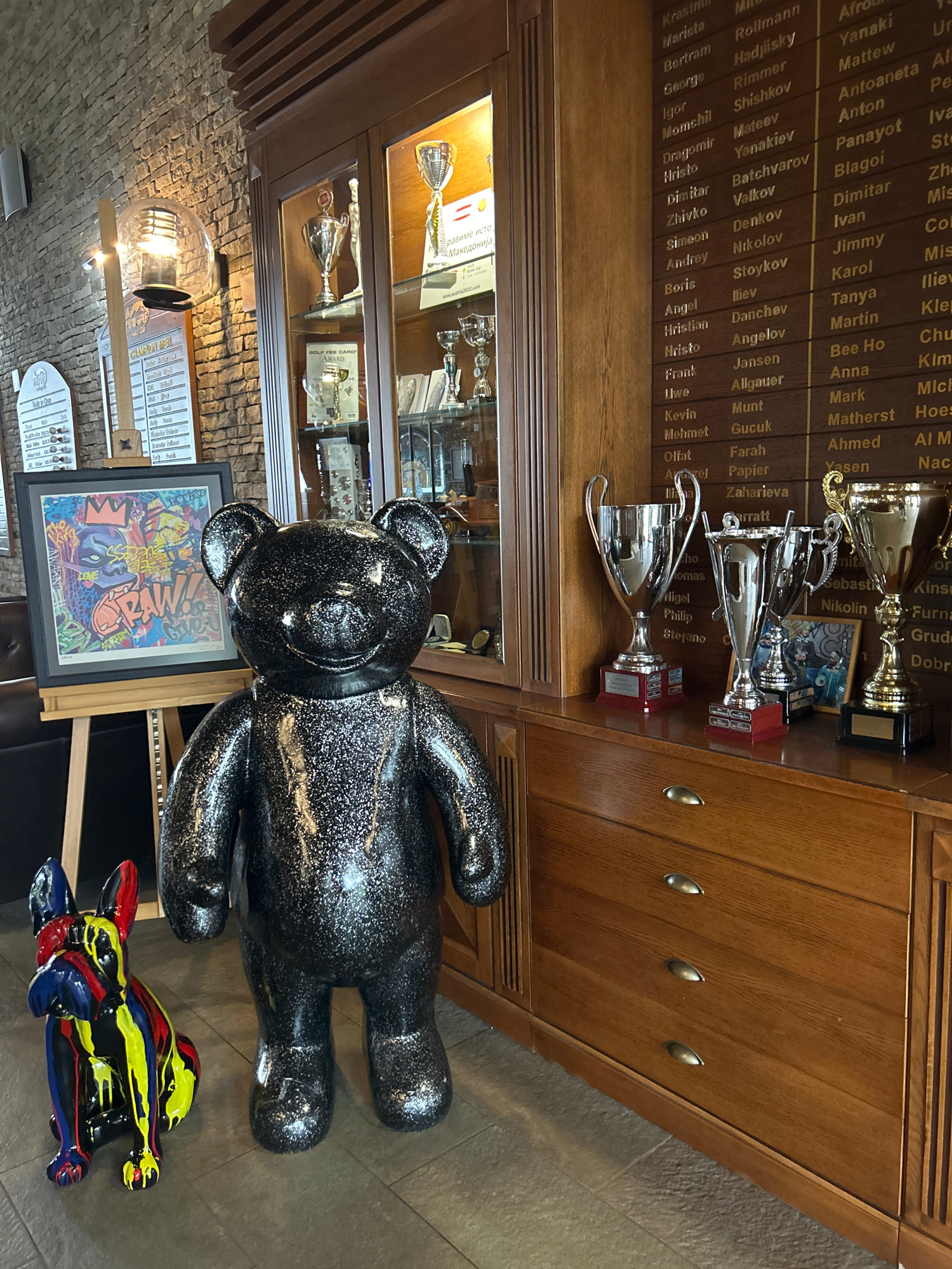 The image shows a scene inside what appears to be a trophy room or a museum exhibit. Dominating the foreground is a large, black, glittery teddy bear statue lying on its side. Next to it is a smaller,…read more