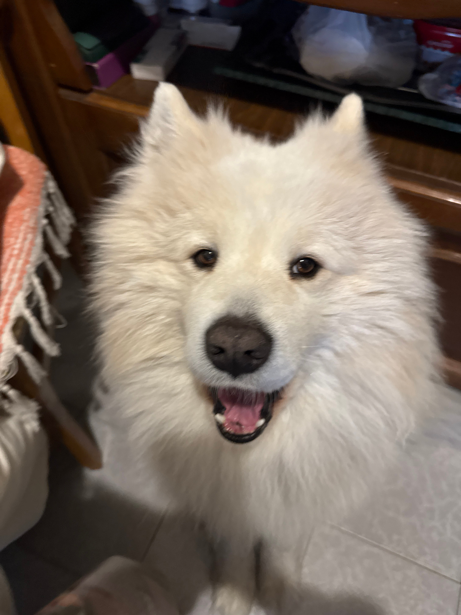 A close-up, slightly rotated, indoor shot depicts a white Samoyed dog with its mouth open, appearing to pant or smile. The dog has dark brown eyes and a black nose. Its fur is thick and fluffy. The ba…read more