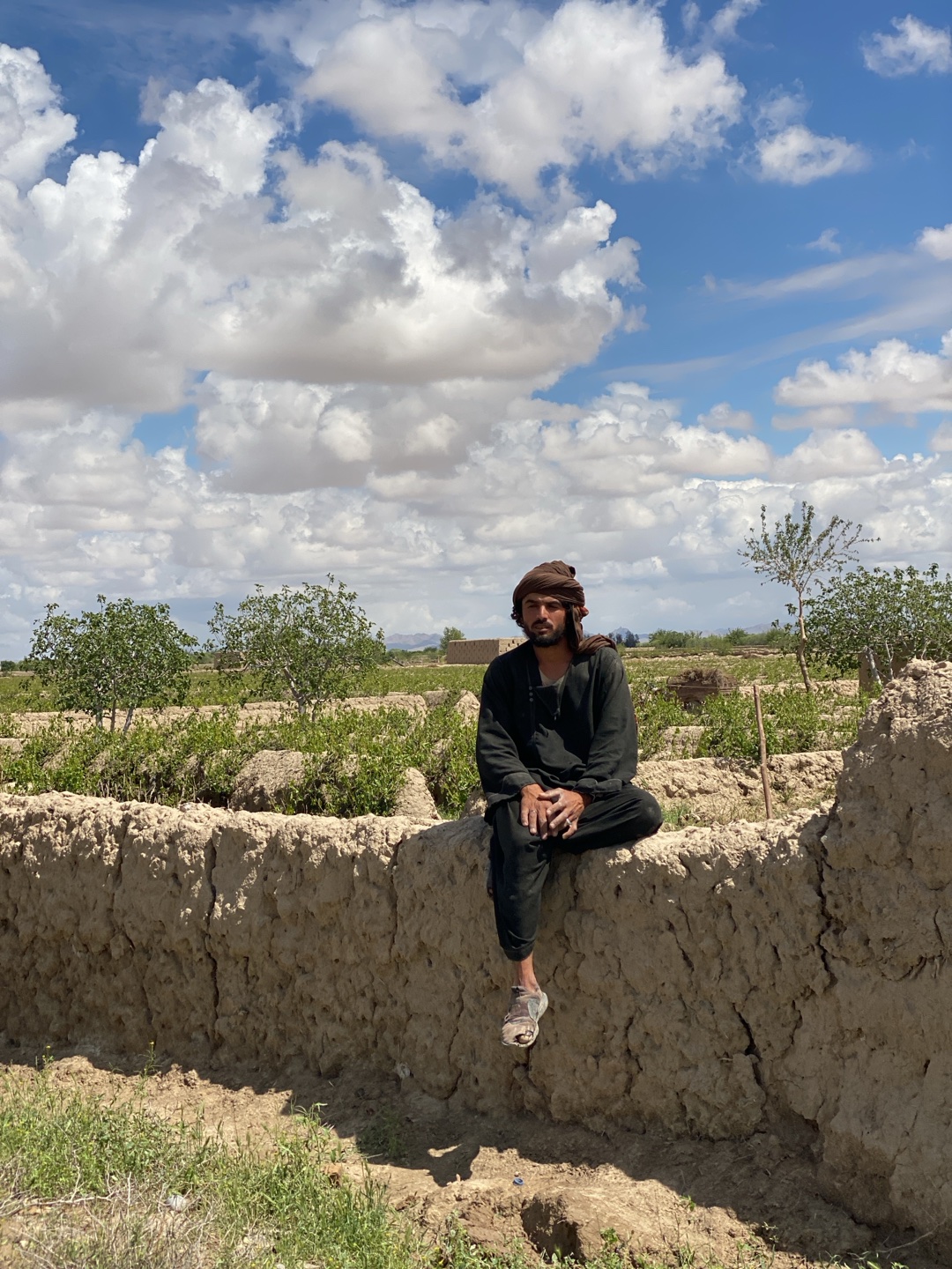 A man is sitting on a wall made of earth in Qazi Kariz, Afghanistan. He is wearing a dark outfit and a turban, and one sandal. Behind the wall is a field with rows of trees. Above, the sky is blue wit…read more
