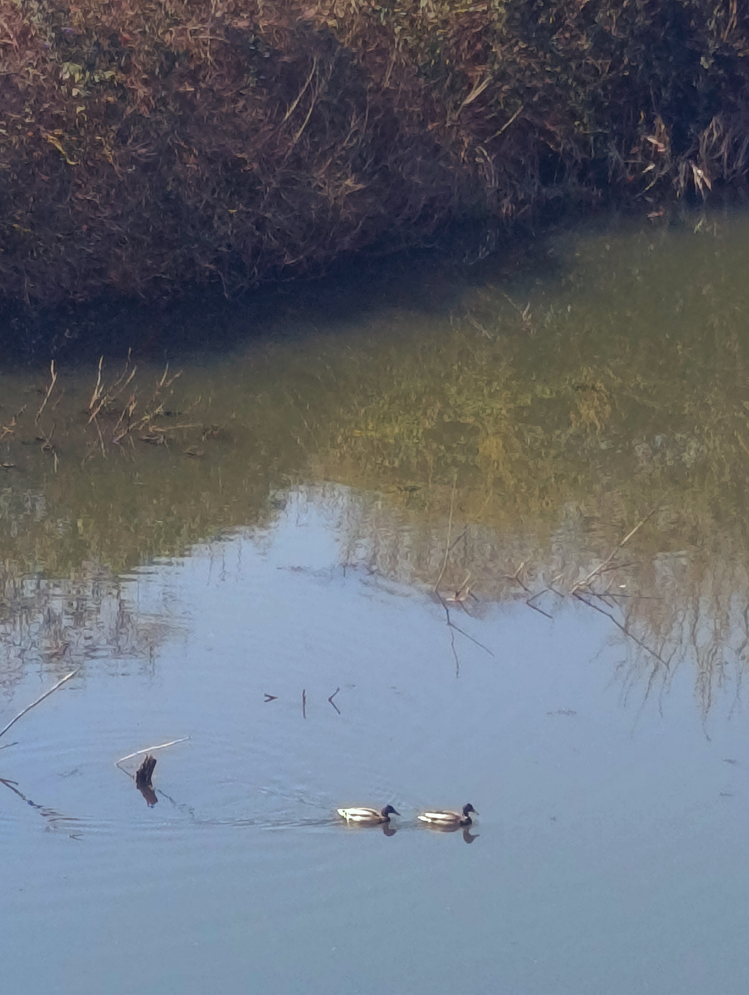 The image depicts a body of water with two mallard ducks swimming in the lower portion of the frame. Vegetation lines the upper bank. Reflections of trees and plants are visible in the water. Small stβ¦read more