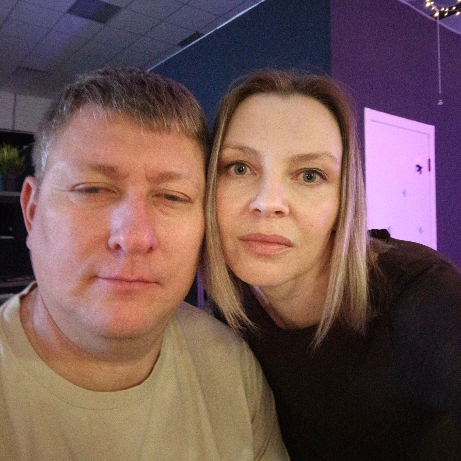 A photo depicts a middle-aged man and a middle-aged woman. The man has short, graying hair and is wearing a light-colored t-shirt. He appears to be squinting in one eye. The woman has shoulder-length…read more