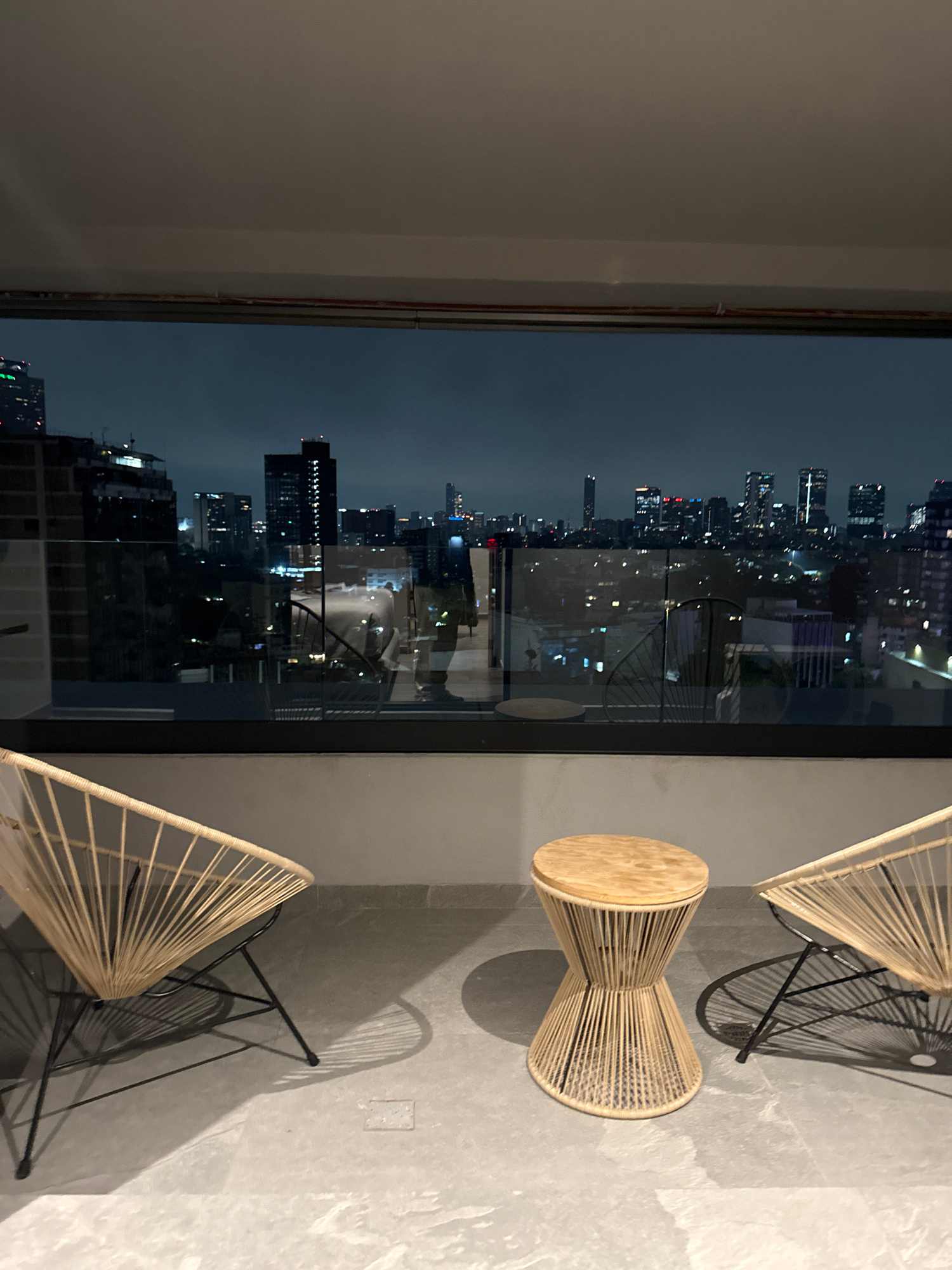 Captured indoors, a modern interior space overlooks a cityscape at night, likely in Mexico City, Mexico. The external urban landscape is visible through a large window, displaying numerous buildings,…read more