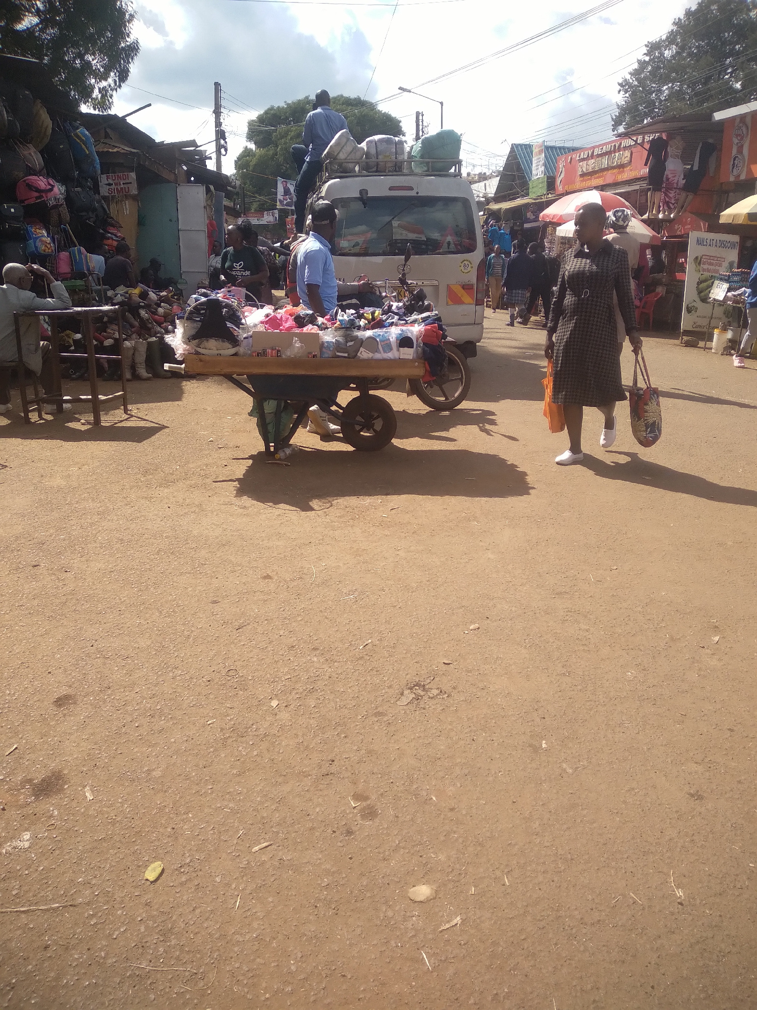 The image shows a bustling street scene in Nyeri, Kenya. The street is unpaved and dusty. A person in a checkered dress and orange undershirt is walking toward the right side of the frame. A cart load…read more