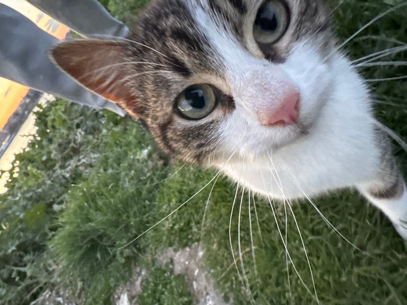 A close-up, high-angle photograph depicts a domestic cat with white and brown fur, a pink nose, and green eyes. The cat's whiskers are prominently displayed against a background of green grass. The cat's head and part of its tail are visible. The background is slightly out of focus. A grey and yellow object appears in the bottom right of the frame. Location details are not discernible from the image. | Open Wire