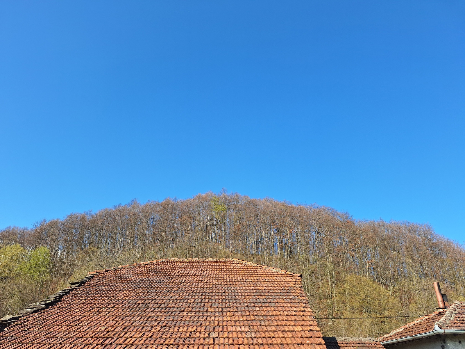 The image shows a view in Apriltsi, Bulgaria. In the foreground is a rooftop covered with orange-red tiles. Behind the rooftop is a hill covered in trees. The trees are mostly bare, though there are s…read more