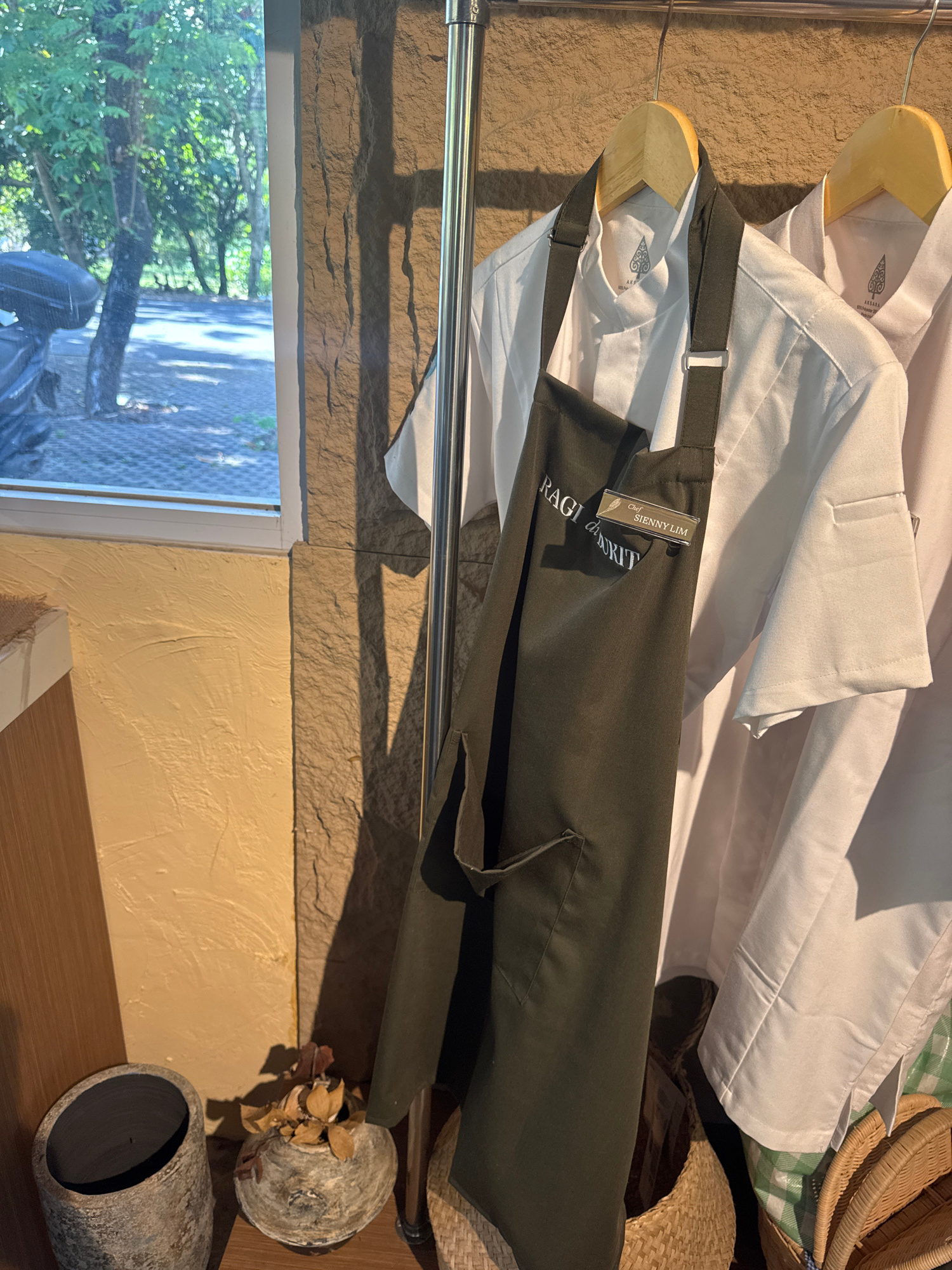 The image presents a chef's attire hanging in what appears to be an indoor space, likely in Kuta Selatan, Indonesia. Visible on a clothing rack are at least two white chef coats, and a dark green or o…read more