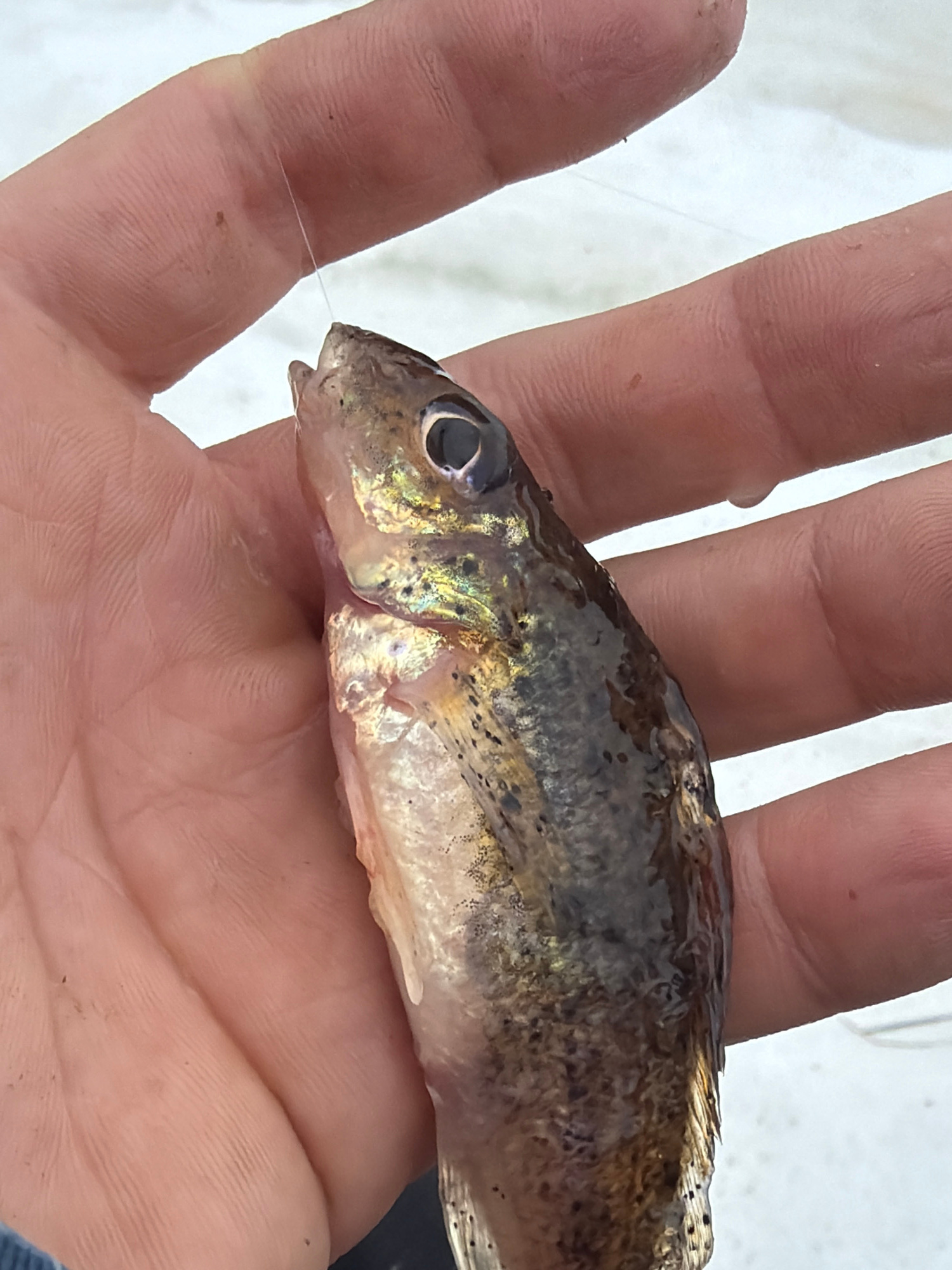 A small, freshly-caught fish is held in a person's hand. The fish, possibly a juvenile or small species, has a dark back with speckled patterns and a silver belly. A fishing line protrudes from its mo…read more