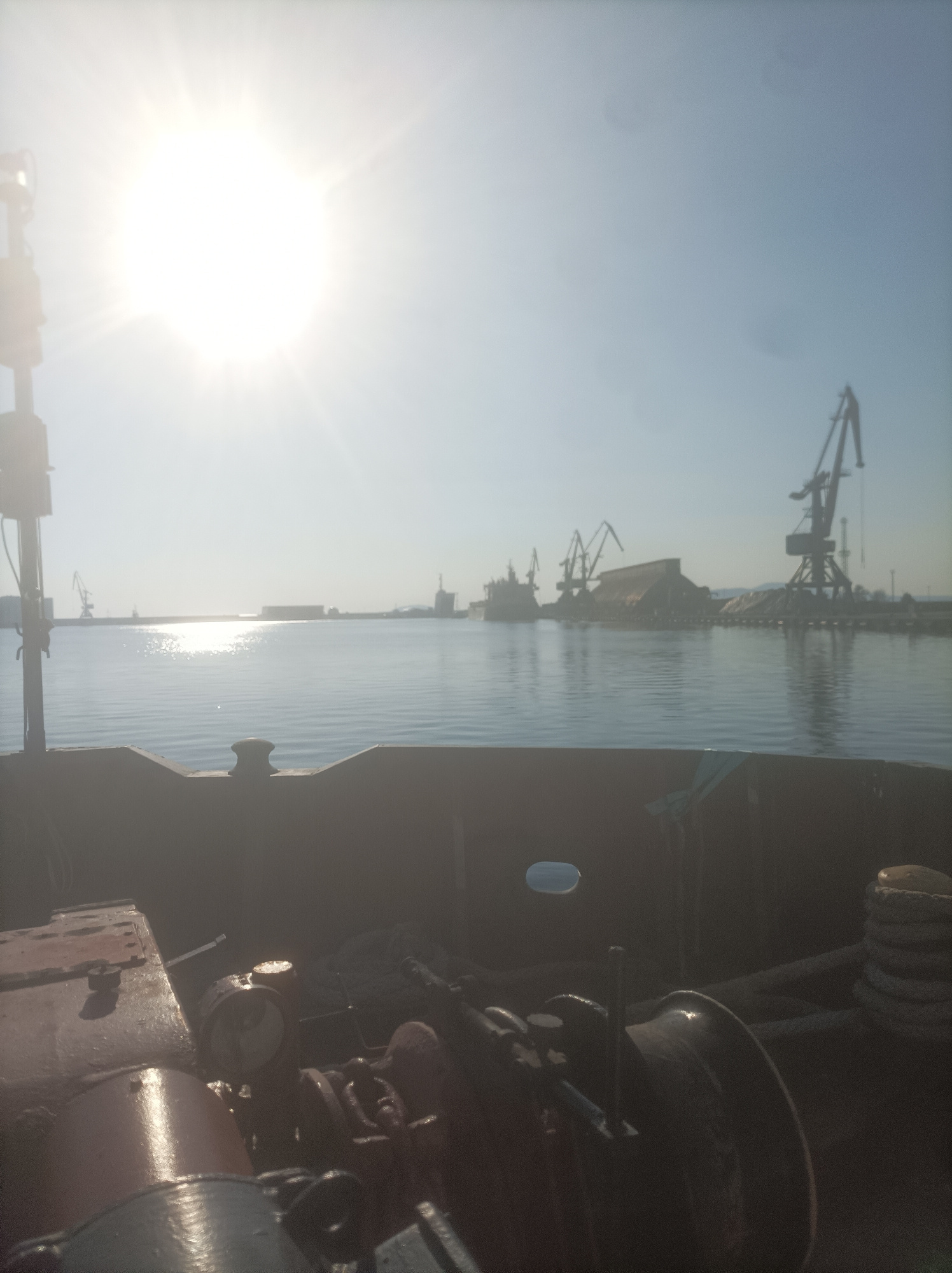 View from a ship's deck in Burgas, Bulgaria, overlooking the Port of Burgas. Cranes and industrial buildings line the port. The sun is bright, reflecting on the water. Ship equipment is visible in theβ¦read more