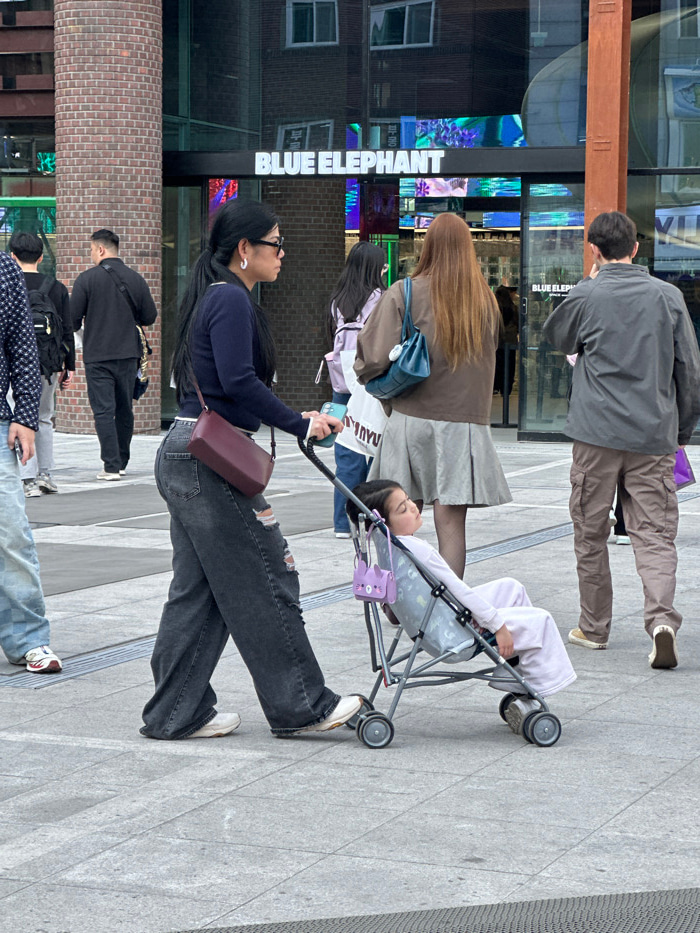 This image captures a daytime scene within an urban pedestrian area in Seoul, South Korea, directly in front of a building prominently displaying the white text "BLUE ELEPHANT" above its glass entrancβ¦read more