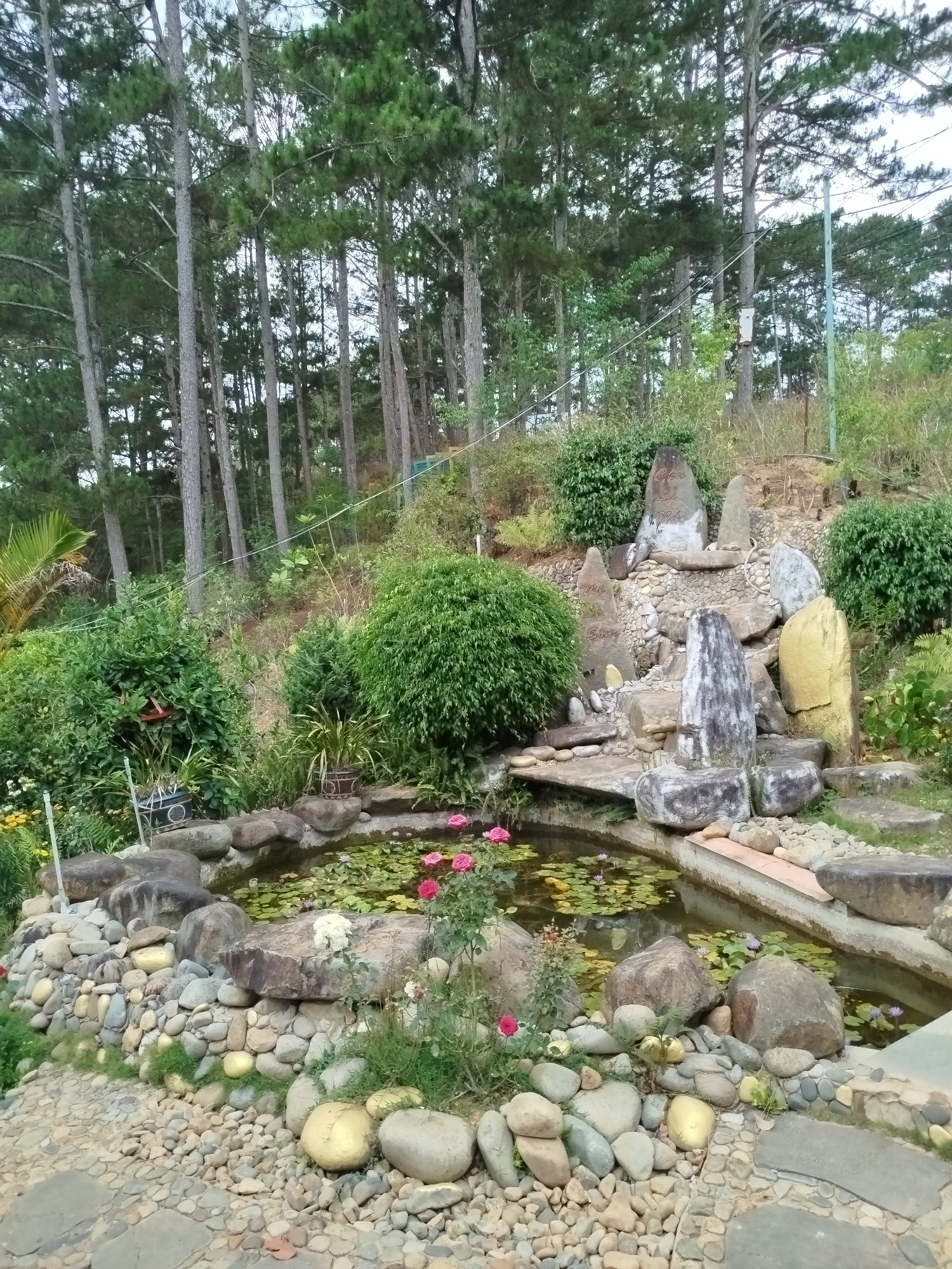 The image depicts a pond surrounded by rocks and greenery, likely located in a park or garden setting. Tall trees are visible in the background. The pond has lily pads and some flowers. A small rock w…read more