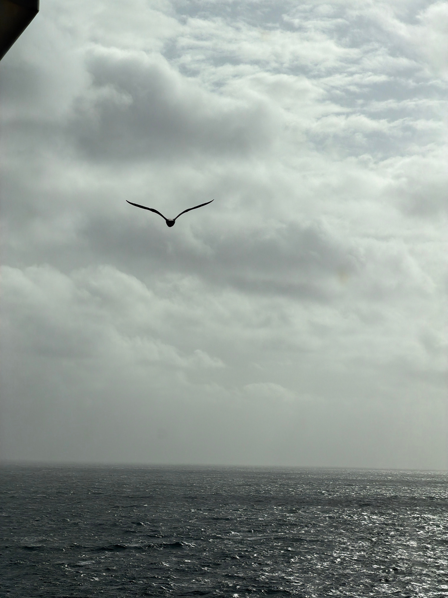 A bird soars against a backdrop of grey, cloud-filled sky, near a body of water. The location is unknown.