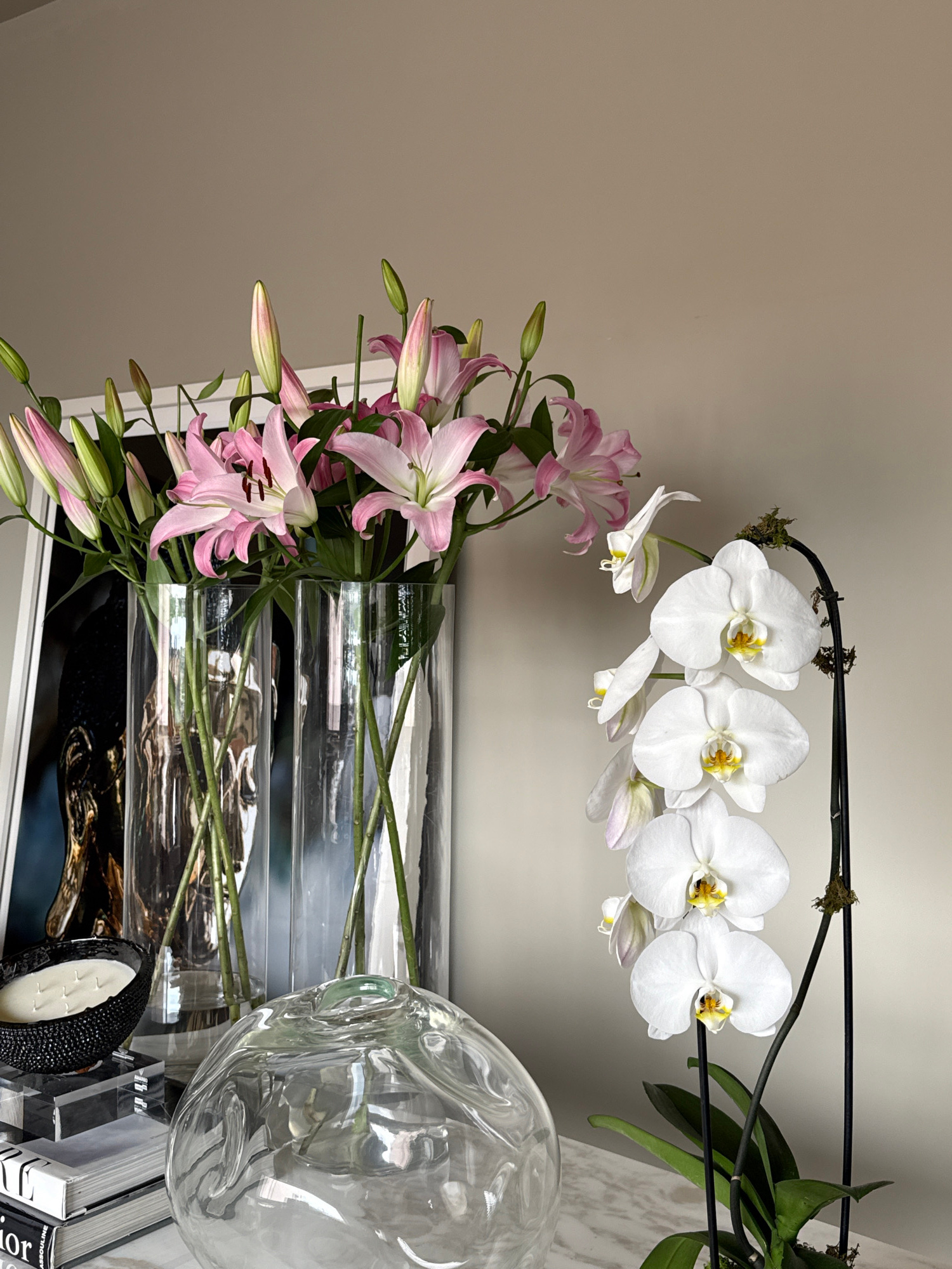 An interior scene, located in Mexico City, Mexico, features a static arrangement of decorative objects and botanical elements. On the left, a stack of large format books, including visible titles such…read more