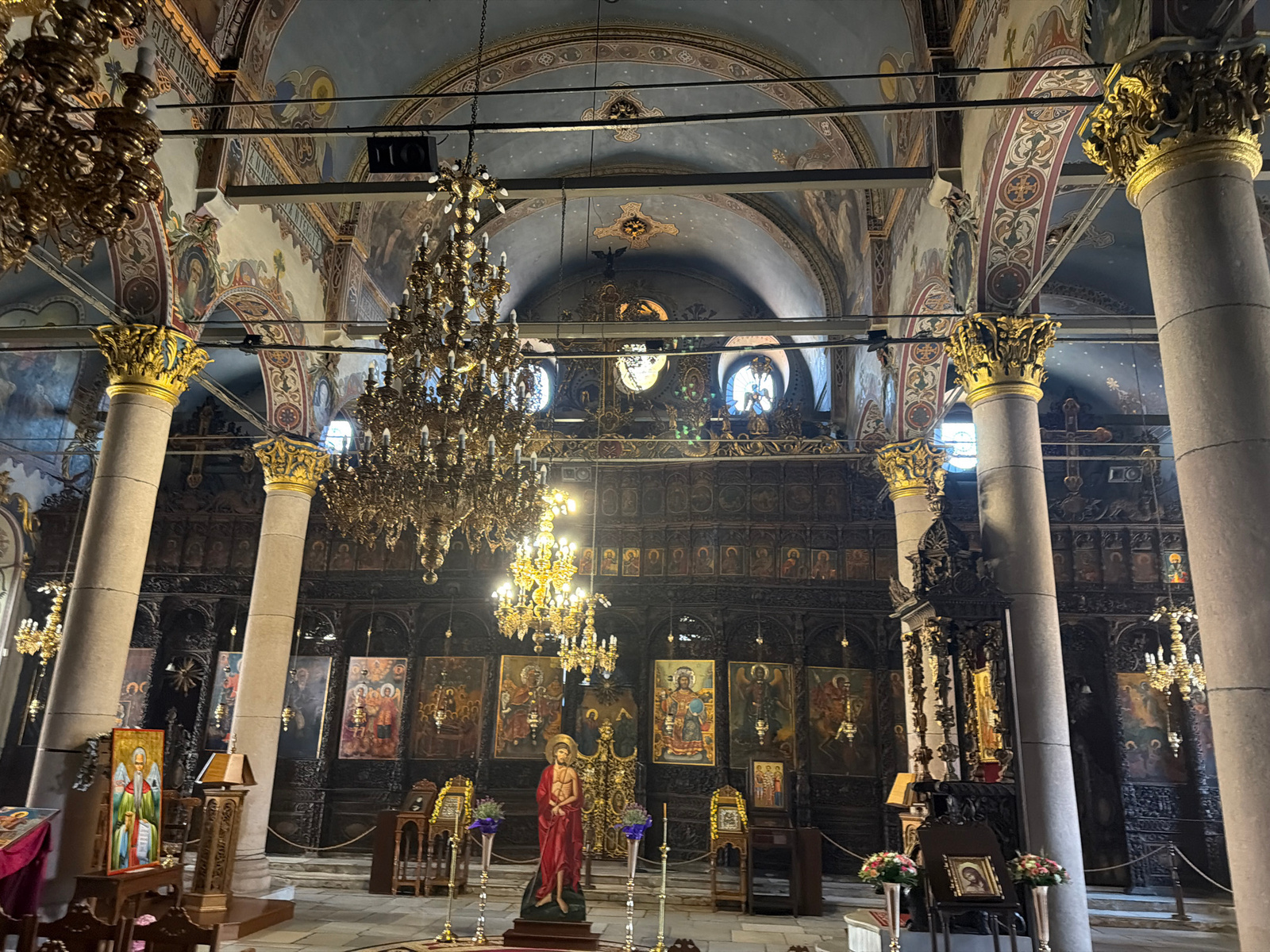 The image shows the interior of the St. Mary Orthodox Church in Pazardzhik, Bulgaria. The church features high, ornate columns with gilded capitals. Ornate chandeliers hang from the ceiling. The walls…read more